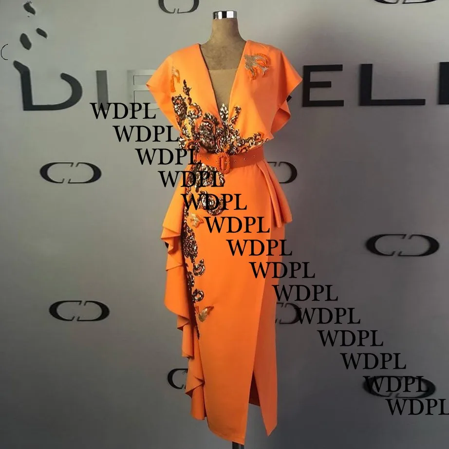 Женское вечернее платье с блестками, оранжевое платье средней длины с рукавом-крылышком, длинное платье до середины икры, для торжественных случаев