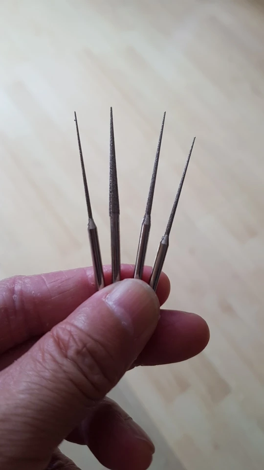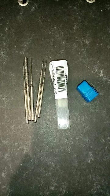 Прибыли в Подмосковье за три недели в консолидированном отправлении. Приобрел в качестве оснастки для гравера. Комплект буров лежит в пластиковом контейнере, хотя контейнер не совсем по размеру и крышка не до конца закрывается. У самого тонкого бура есть биение на кончике и тонкие буры легко гнутся. Хвостовик - 3мм. Напыление удовлетворительное. Можно использовать в качестве надфиля. Для моих задач подходят.
