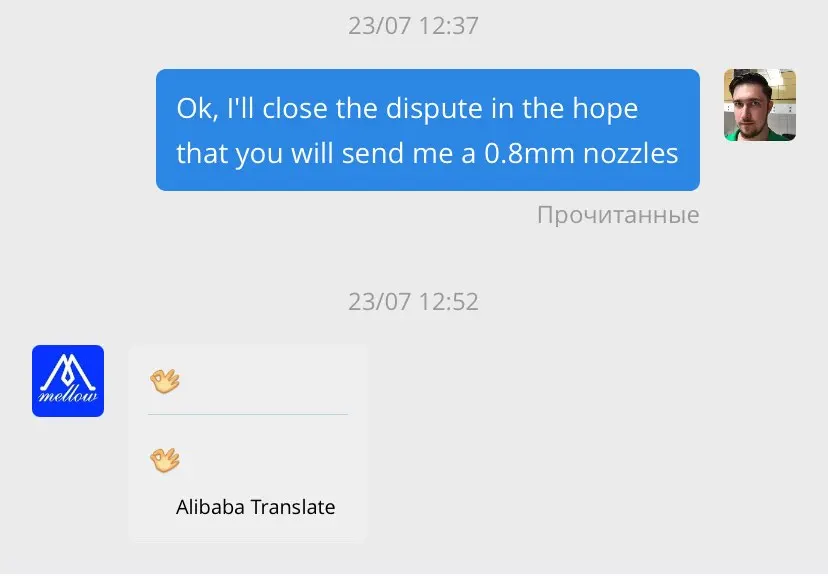Продавец прислал не тот размер сопла. Выслал 0.4 мм вместо 0.8 мм. После открытия диспута он согласился на отправку 0.8 сопел. За два месяца так ничего и не пришло, трекномера нет. Продавце обманул, чтобы я закрыл диспут! Мне сопла 0.4 вообще не нужны! Сопла сами нормального качества
