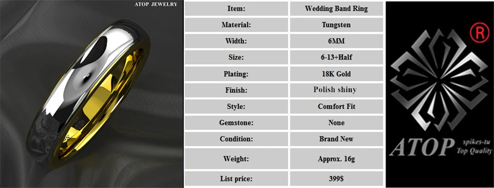 Вольфрамовое мужское кольцо Золотое обручальное кольцо 6 мм купол С...