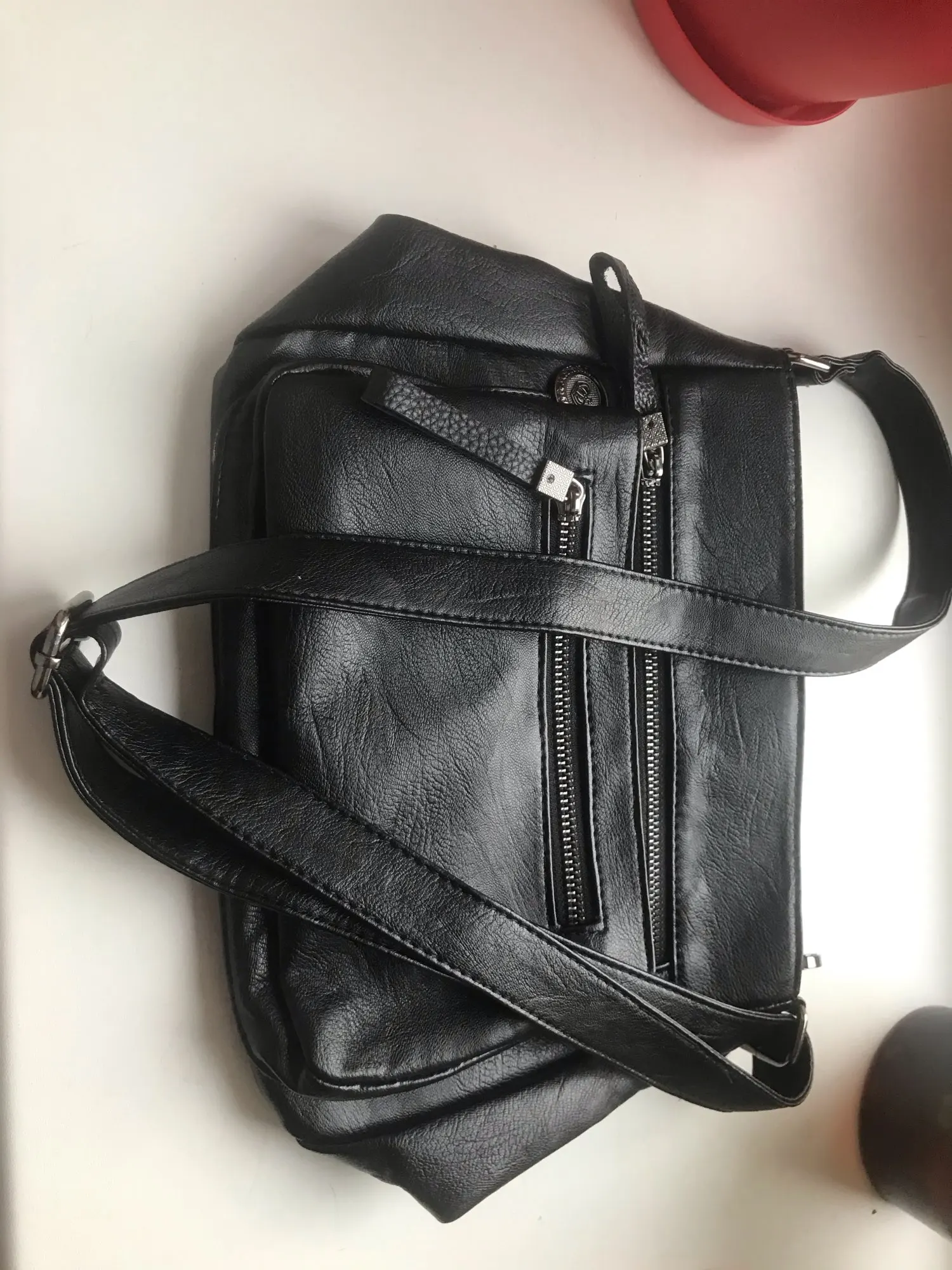 Описание и реальность довольно таки точное. Пошито хорошо, всё ровно. Кожзам выглядит не плохо, но вот ручки выполнены с более дешёвого материала, это плохо. Не понравилось, что молнии на лицевой стороне, на кармашках металлические. Я не люблю такие, вечно цепляюсь за них. Остальные молнии пластиковые, это радует. Ремешок, для меня, слишком широкий. Почти 3 сантиметра. Длина устраивает. Размер сумки не плохой, имеется много кармашков внутри и снаружи. Я вообще люблю более "лёгкие" сумки, а эта как то тяжеловато выглядит. Но я довольна товаром. Могу смело рекомендовать к покупке. Продавцу спасибо. Отправил не сразу, но дошло быстро. 25 дней от оплаты до получения.