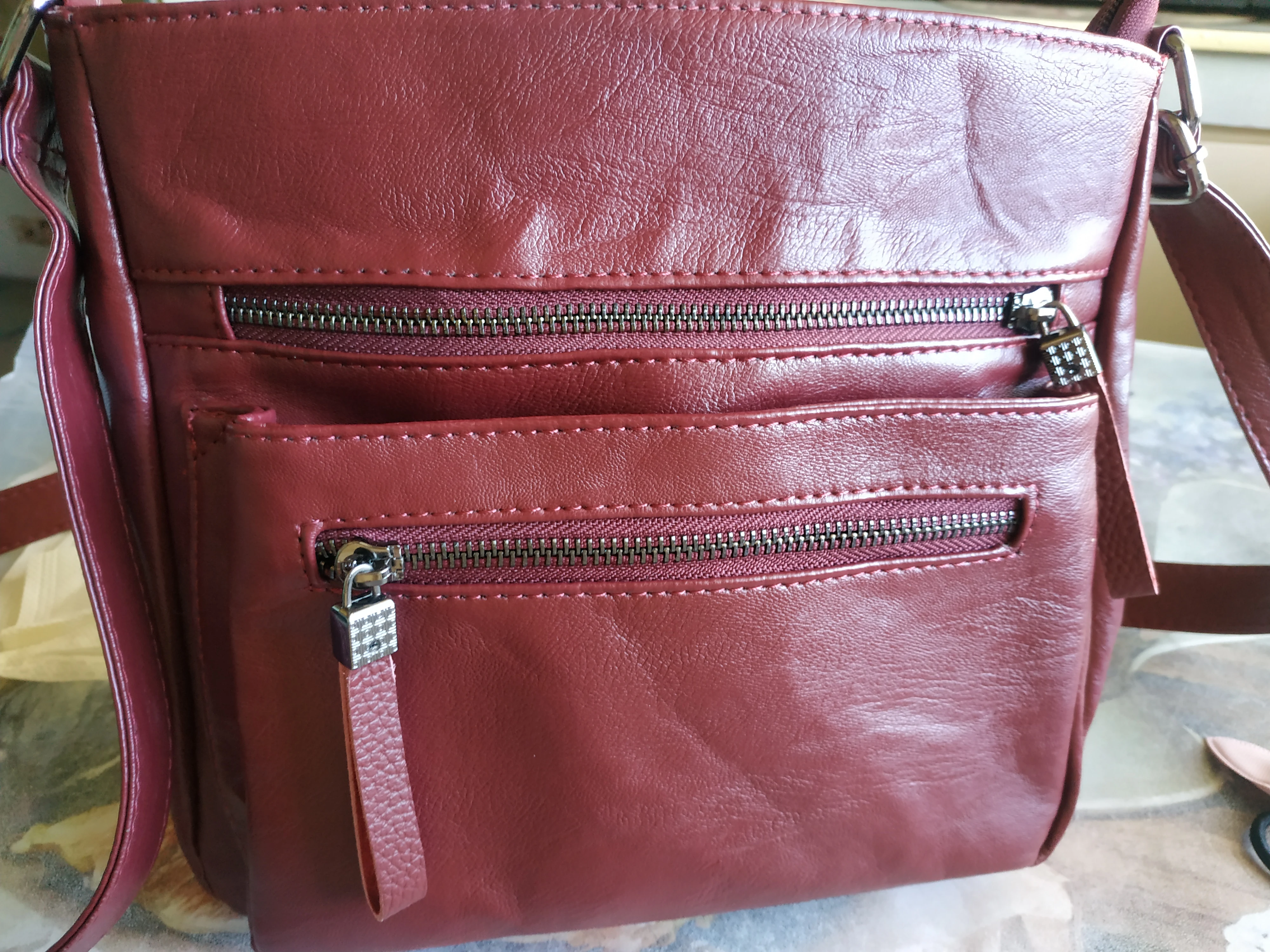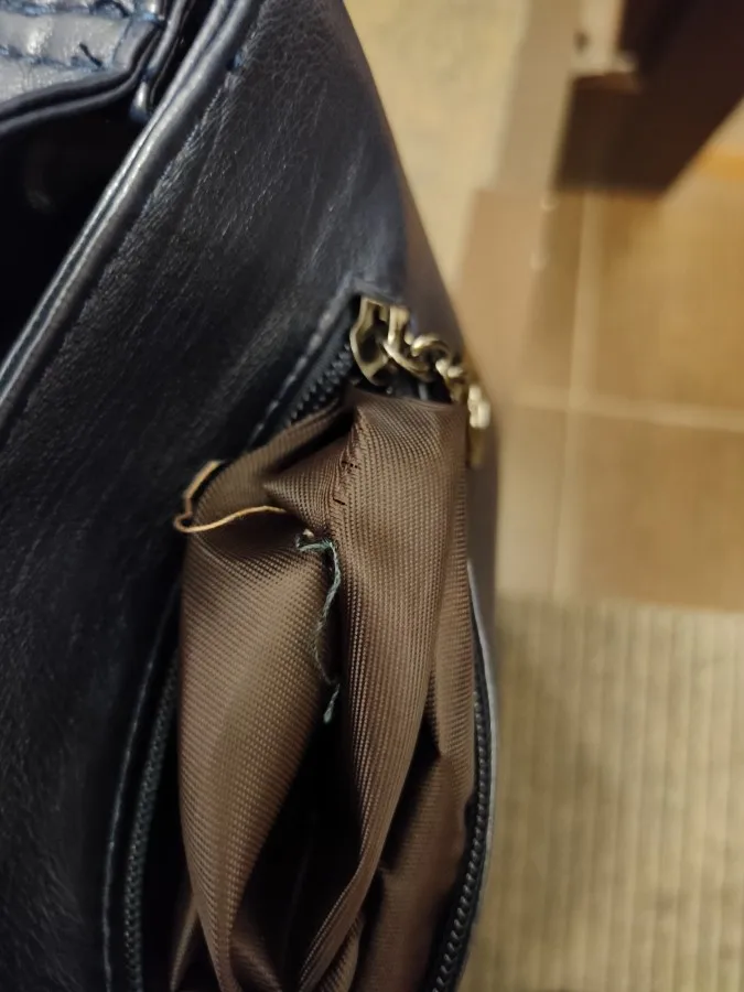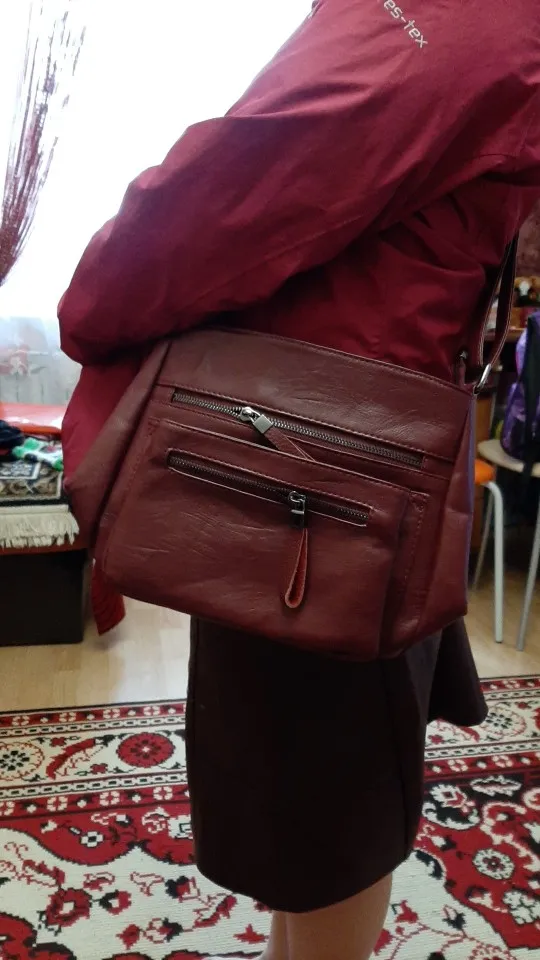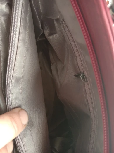 В целом сумка хорошая. Небольшая, но вместительная, цвет соответствует. Много карманов. Расстроило, что в одном сильно разошлась подкладка. Зашивать очень неудобно в таком месте. Кожа очень мягкая - легко прикололась брошка (снегирь на фото), не знаю, как такая тонкая будет носиться. Молнии рабочие. Дошла до МО за 10 дней