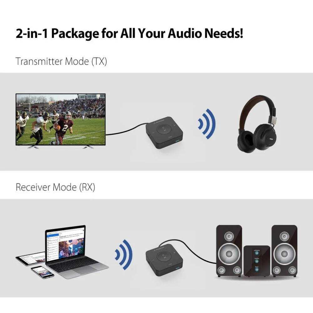 Передатчик-Bluetooth-Включите телевизор, av-приемник (e.g. Yamaha, onyo, Denon), TV Box и т. Д., или передавать аудио в любые Bluetooth наушники/колонки, например. Bose, Beats, Sony, Plantronics, Apple AirPods.