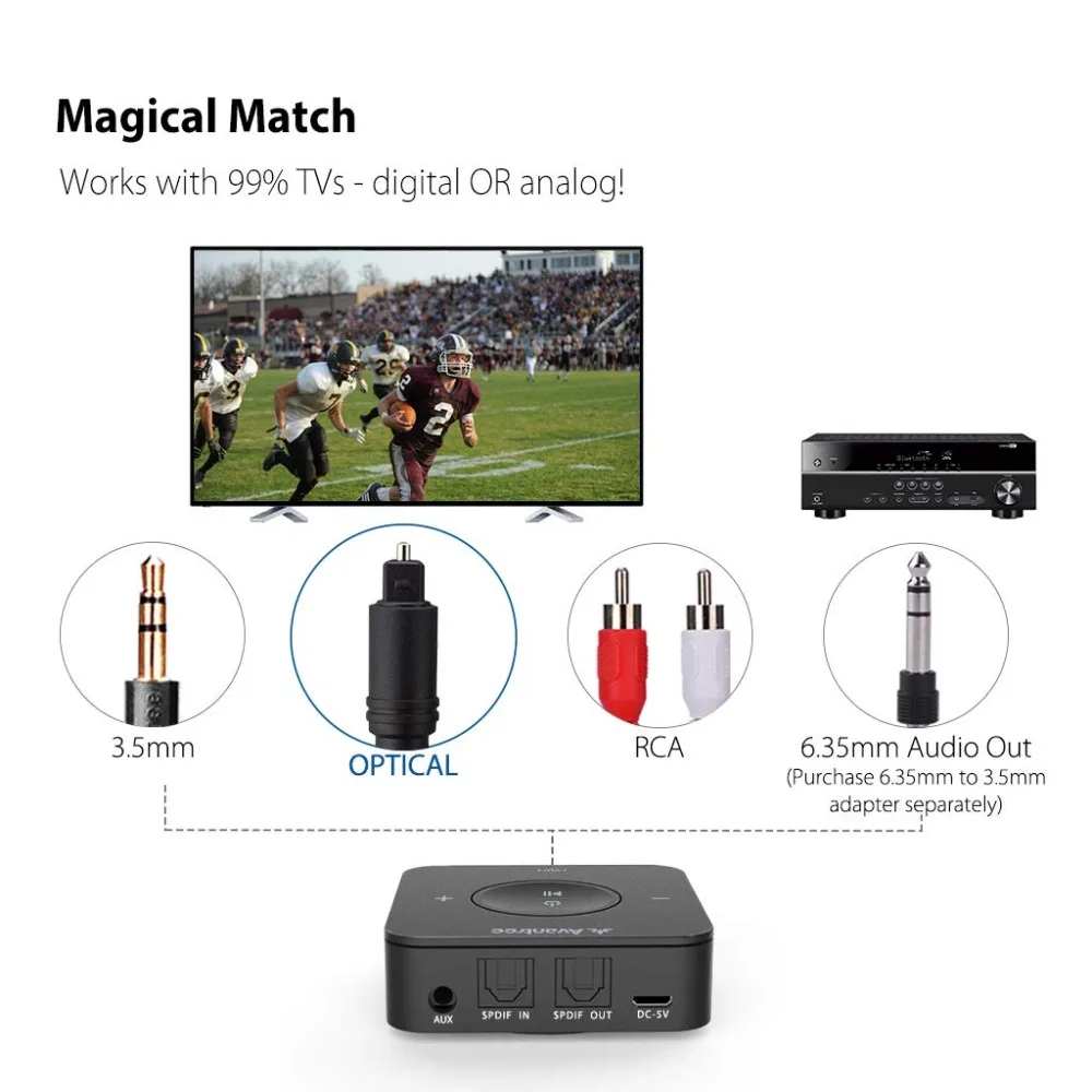 Avantree TC417 aptX низкая задержка Bluetooth 4,2 передатчик приемник с регулятором громкости (оптический цифровой Toslink, 3,5 мм AUX, RCA), 20 часов воспроизведения, беспроводной аудио адаптер для ТВ, домашняя стереосистемаОтпустите поток: Bluetooth-Включите телевизор, ПК/ноутбук или другое Любимое устройство и беспроводное подключение к наушникам! Поставляется в комплекте с конструкция «2 в 1, вы можете также использовать TC417 в качестве приемника для bluetooth-включить ваш любимый Проводная колонка, звуковая панель, домашний кинотеатр и т. д.