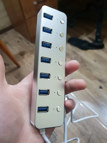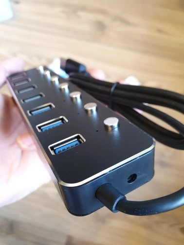 Хороший хаб. Достоинства: корпус из алюминия почти весь, кабель несъемный но вполне качественный, индивидуальные выключатели разрывают цепь питания (возможно и data). Выключатели механические, сохраняют свое положение, что для меня было важно. Недостатки: нет световодов, поэтому один светодиод светит сразу в несколько портов и сложно понять какой именно включён. Работает на скорости USB3 gen1 (5Gbps). Использую для маломощных устройств без дополнительного питания.