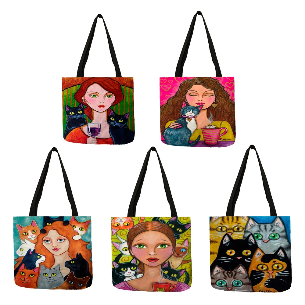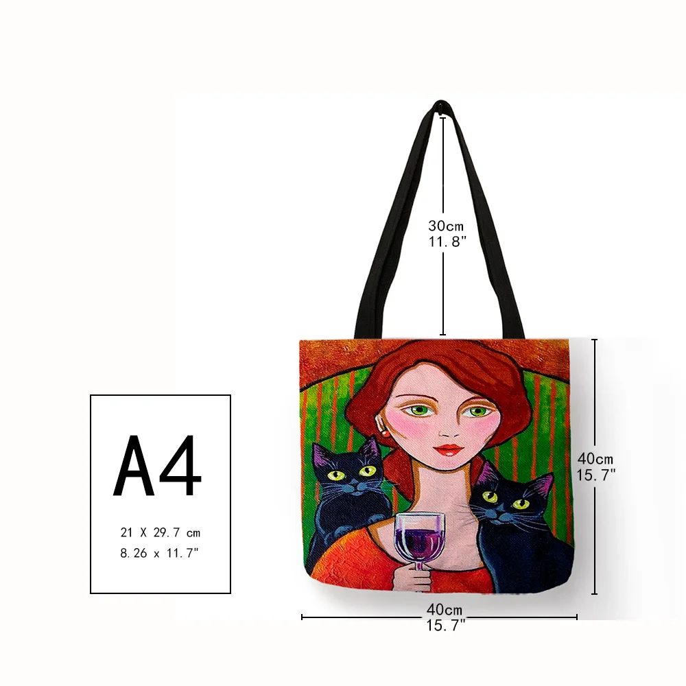 Яркая сумка для покупок, королевская Дамская винная сумка с принтом черного кота, качественные льняные повседневные уличные тоуты