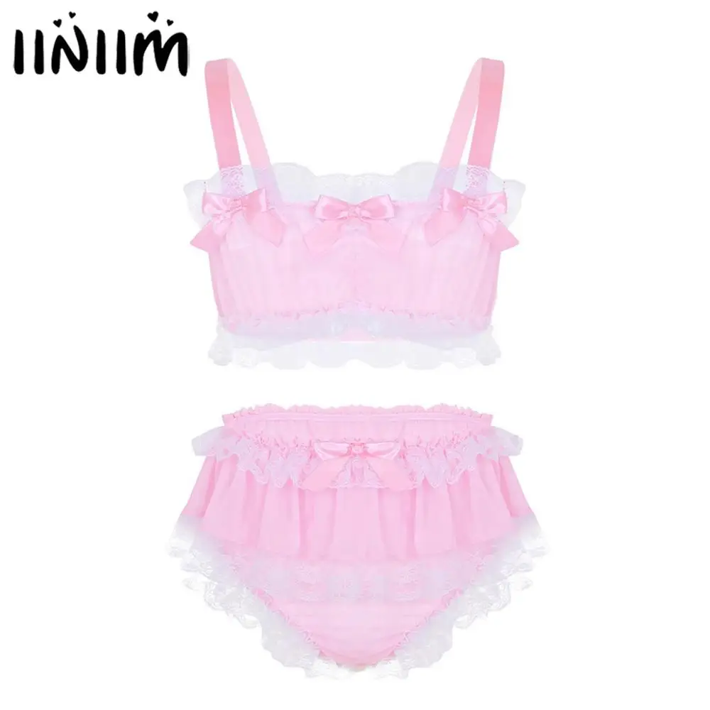 Комплект нижнего белья Sissy Fun для мужчин, кружевной прозрачный шифоновый кроп-топ без рукавов с оборками, пикантное ночное белье