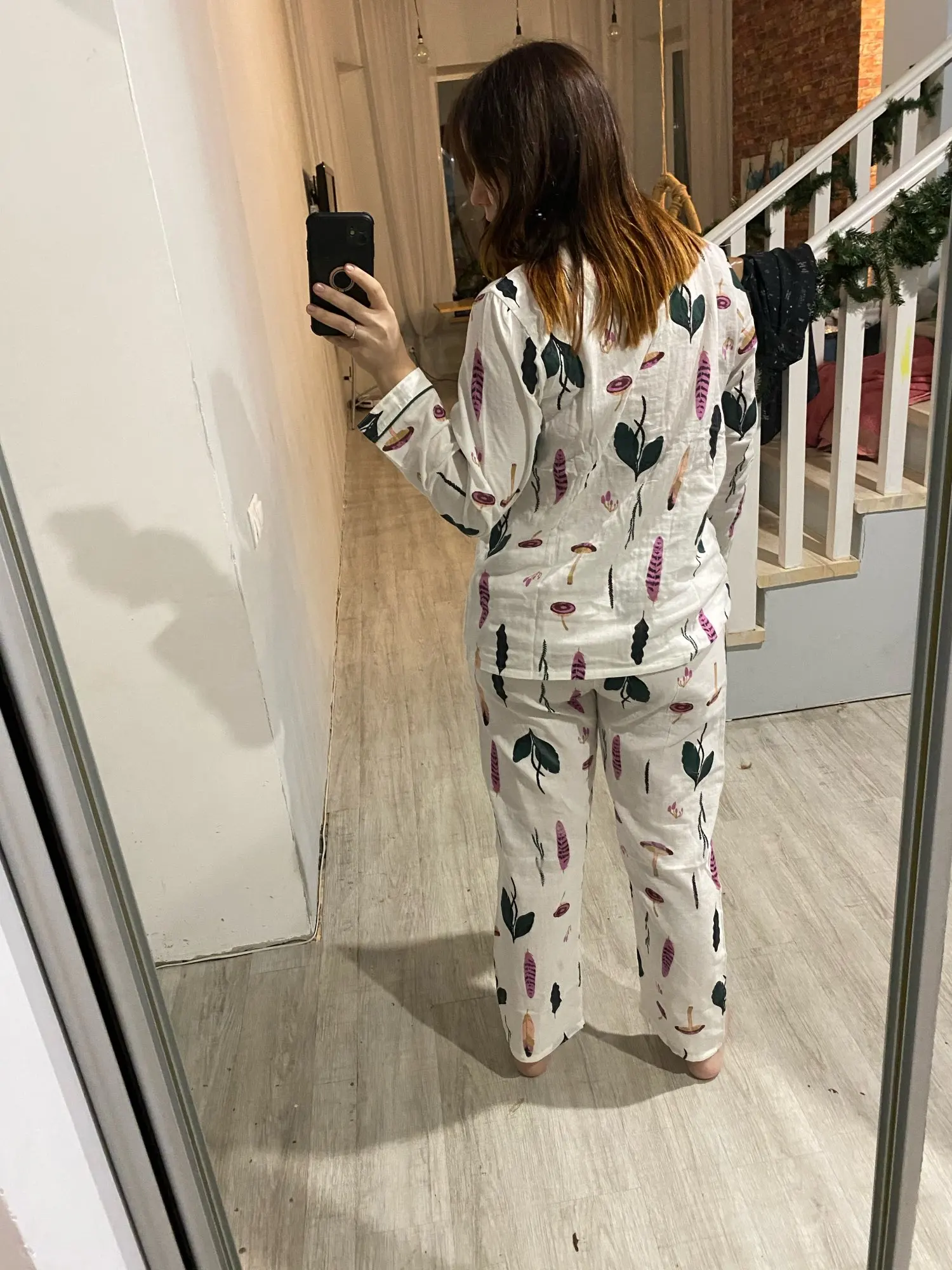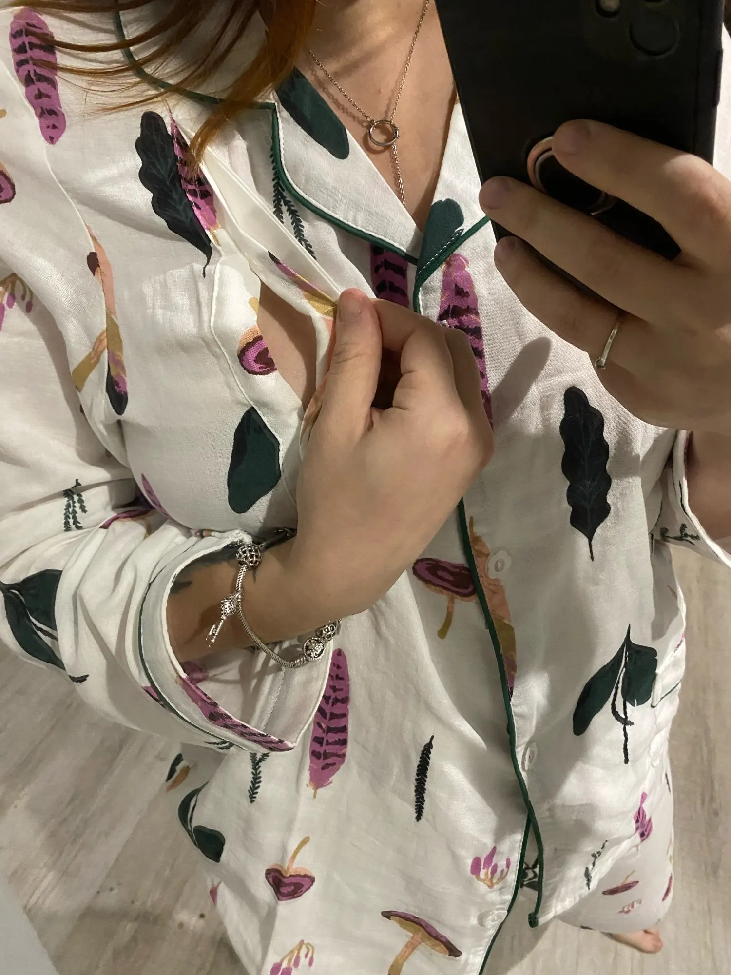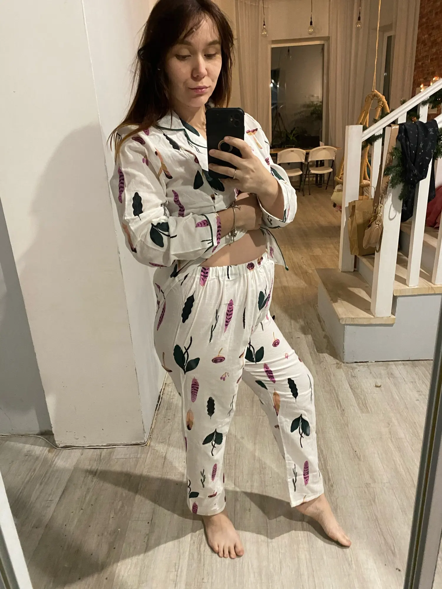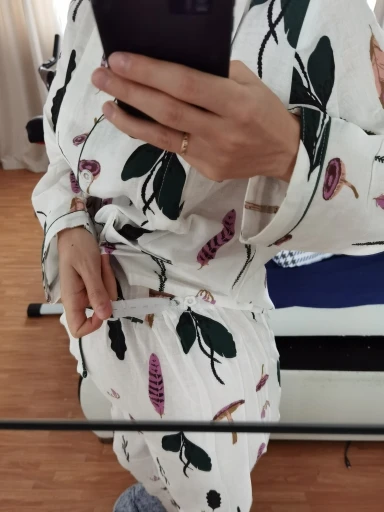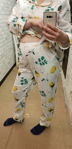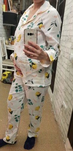 Одна из немногих покупок с Али, которой я осталась очень довольна) ткань натуральная, легкая и приятная к телу. принт красивый, хорошо пропечатанный и не тусклый. большие кармашки для кормления, а на штанах утяжка, подходящая на любой срок беременности. у меня животик еще не большой, но места в штанах этой пижамы точно хватит до самых родов. размер взяла Л на свой С-М. Смотрится чуть великоватой, но для пижамы-самое то, и свободно, и удобно) рукава и штанины на рост 165-отлично) доставка меньше месяца. РЕКОМЕНДУЮ))))