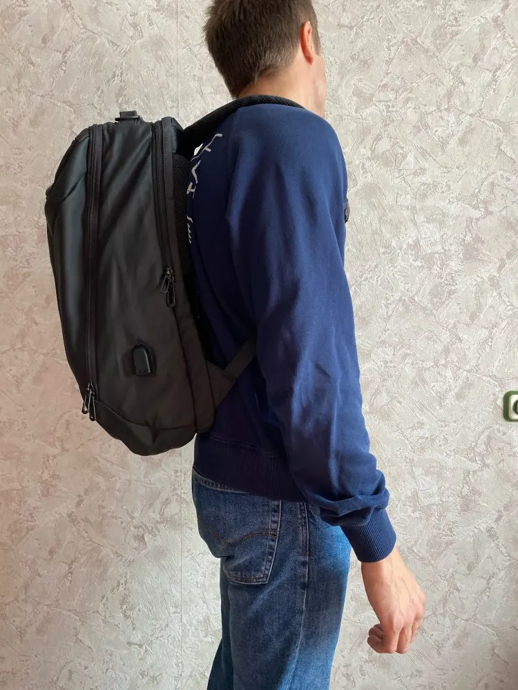 Мужики, рюкзак просто БОМБА! Купил за 2.300 на распродаже 11.11. Карманов много, качество отличное, внешний вид огонь! Очень доволен покупкой! В подарок чехольчик на рюкзак. Покупайте, не пожалеете! Ноут 15.6 влетел со свистом, 17 дюймов так же залезет. Берите с тремя отделами. Он не выглядит громоздким, всё как надо. Добротный рюкзак для нормальных пацанов! Доставка 7 дней из РФ.
