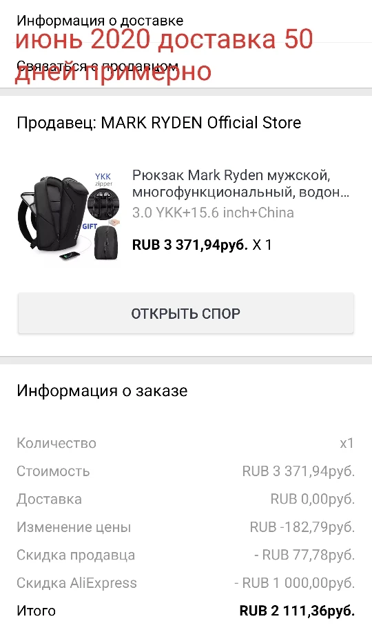 Рюкзак шёл больше 3х месяцев. Продавец поменял трек номер. Был открыт спор для возврата денег, но в итоге товар пришёл. Рюкзак отличный.