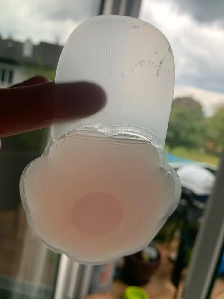 Накладка приятная на ощупь. Пришла с прилипшей грязью, но все легко отмылось. Язычок, который должен подтягивать грудь при минимальном натяжении на груди проделжался 1,5 минуты. Сама накладка держится нормально, но долго я не с ней не ходила(время тестирования 5 минут).
