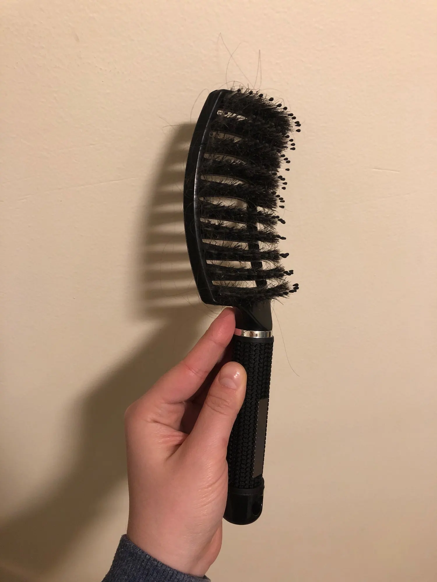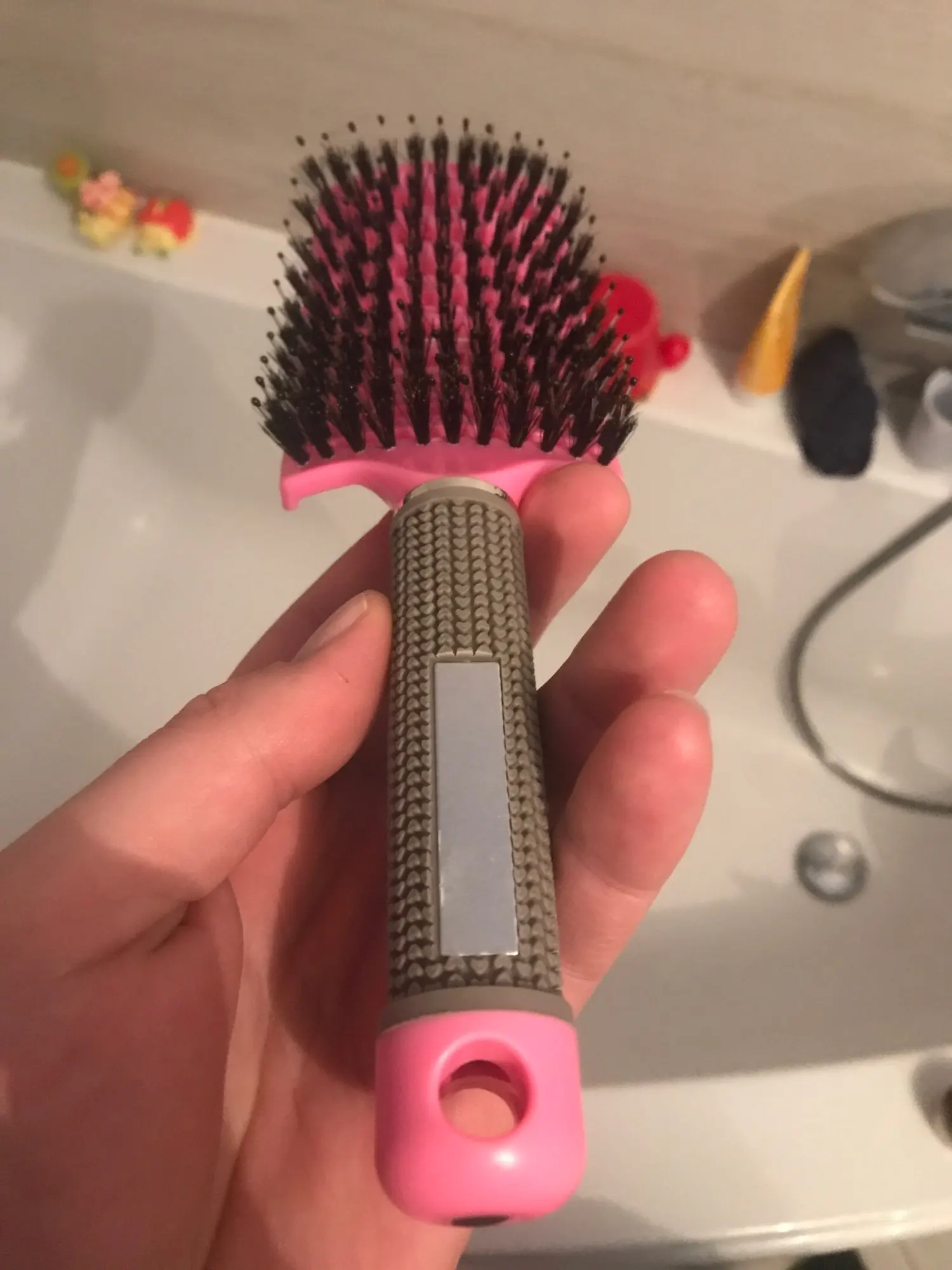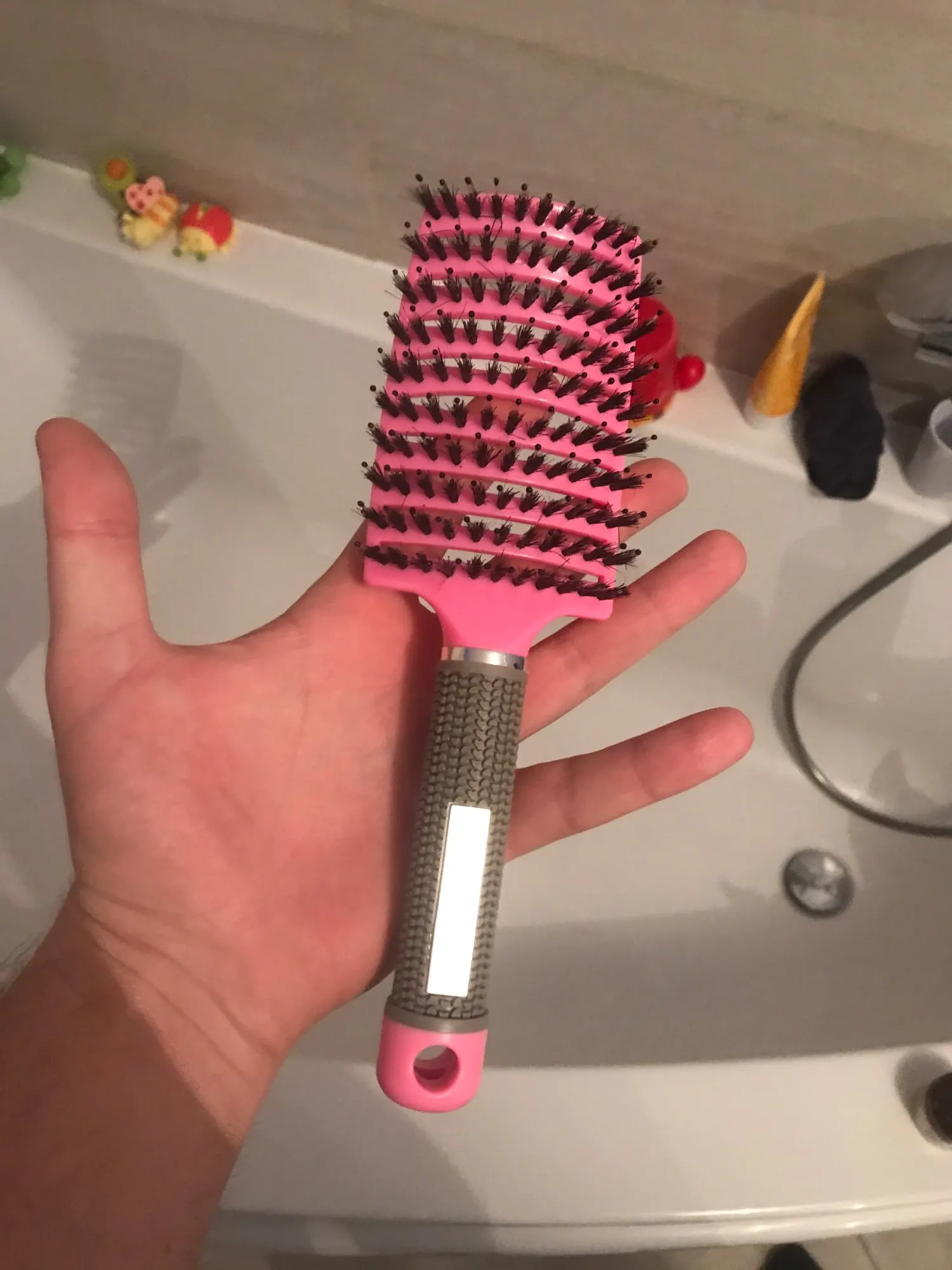 Масажка хорошая, ручка прорезинина, у меня волосы длинные ещё и блонд очень путаются чесать теперь одно удовольствие. Выложила фото рядом брашинг круглый на нем намного больше щётинок, так бы хотелось и на этой масажке побольше щётинок, но и на такой спасибо.