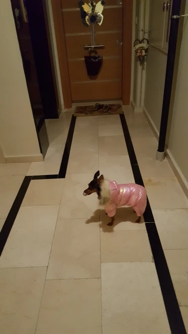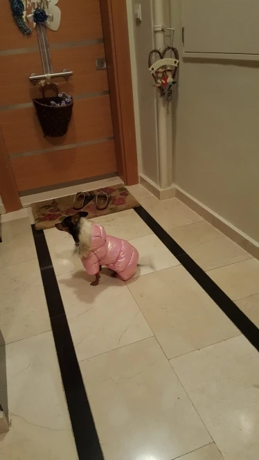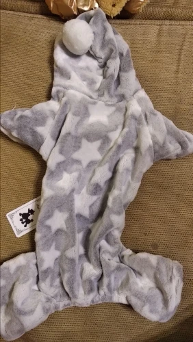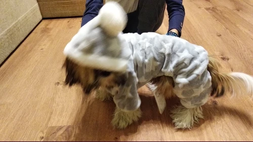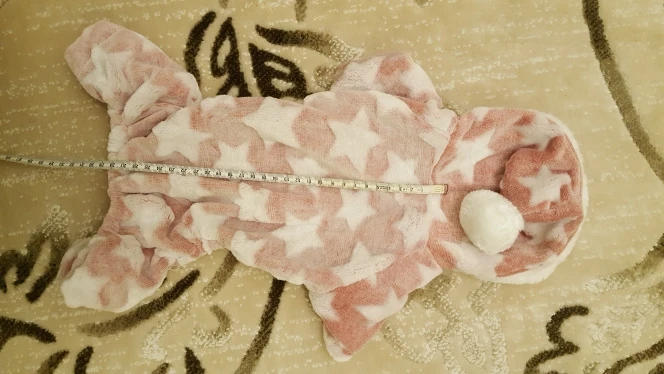 Очень милый и теплый комбинезончик. Капюшон кошке мешает, пришлось пумпон пришить к спинке, чтобы не болтался. На кошку около 5 кг весом размер 2XL хорошо подходит по длине, но болтается по ширине. Периодически кот из комбинезона вылезает через горловину.