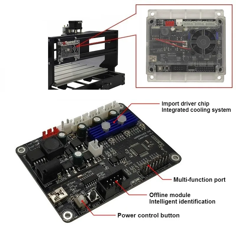 Шпинделя: 775 мотор шпинделя 24V 10000r/мин Сверла: диаметр: 3,175 мм наконечник: 0,1 мм длина: 30 ммПанель управления: двойная ось Y, четырехосевой привод, полнофункциональная. Лазерный выход 2P/3P поддерживает функцию pwm TTL