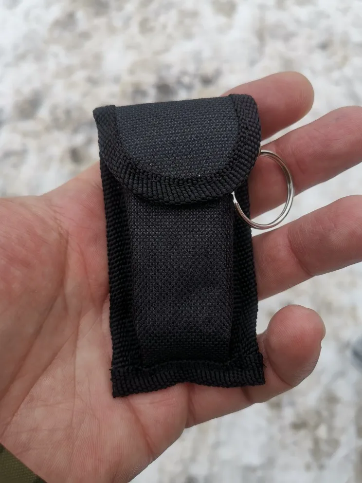 Миниатюрный, на 2/3 брелок, на 10% мультитул. Смазан маслом, «нож» немного заточен, пакет проткнуть может.