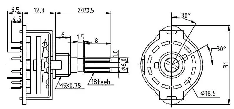 Поворотный переключатель RS25, крепление на панель вала 2P6T, 2 пол...