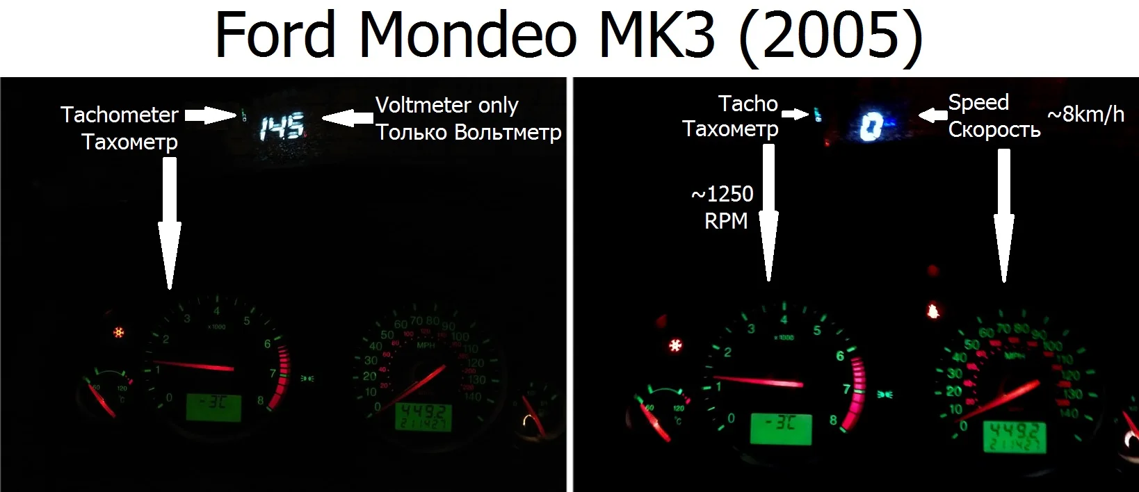 RU: Покупал для Ford Mondeo 3 (поколение 2000-2007, мой авто 2005 года), но с ним не заработало, походу там всё-таки OBD1, а не OBD2. При подключении работает только вольтметр, всё остальное - тахометр, спидометр и температура ОЖ стоят на нуле. Но я понимал риск при покупке, поэтому никаких претензий. /// В семье есть Octavia Tour (2007 года), подключил и на ней всё заработало, в ней и оставил. /// EN: Doesn't work with Ford Mondeo MK3 (2000-2007), shows only voltmeter. Fully works with Skoda Octavia Tour (2004-2010)