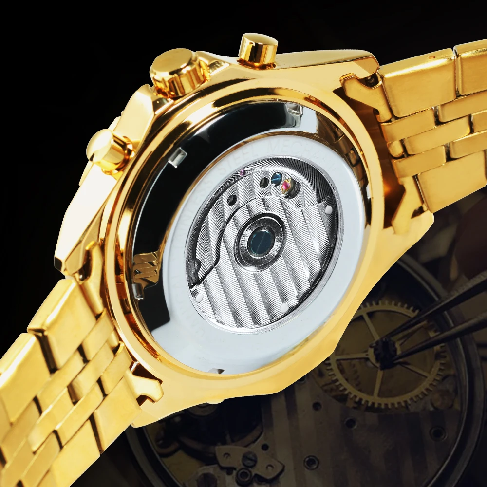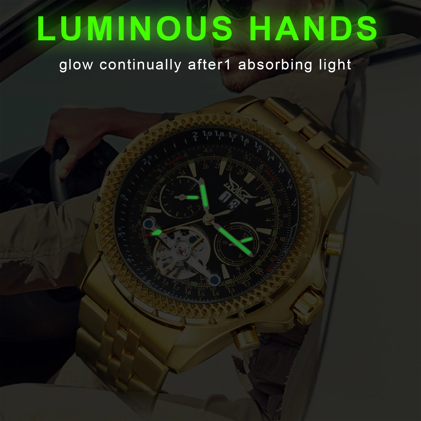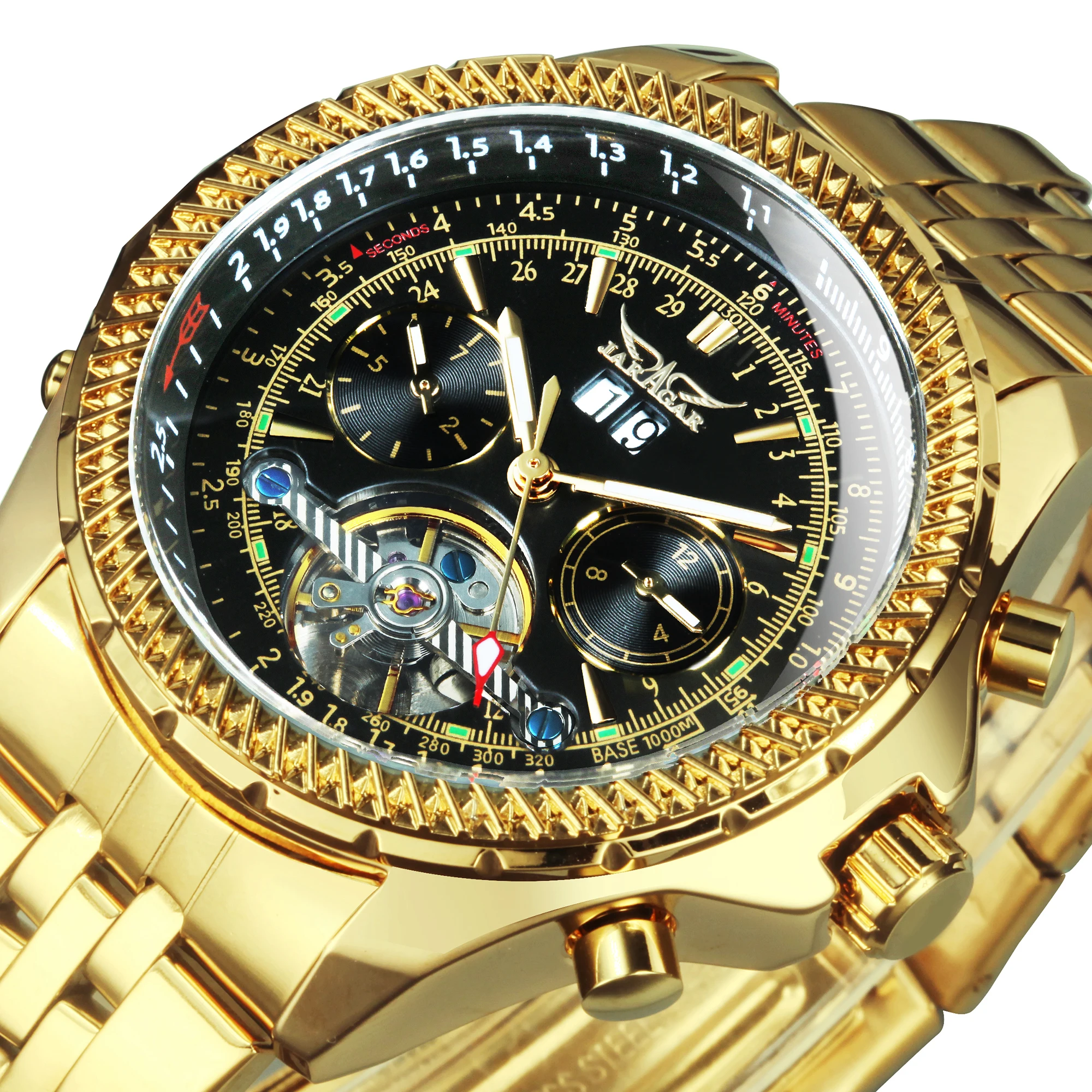 Часы наручные мужские автоматические механические, роскошные Брендовые с турбийоном, с большим стальным ремешком, золотистые, с календарем, 2021