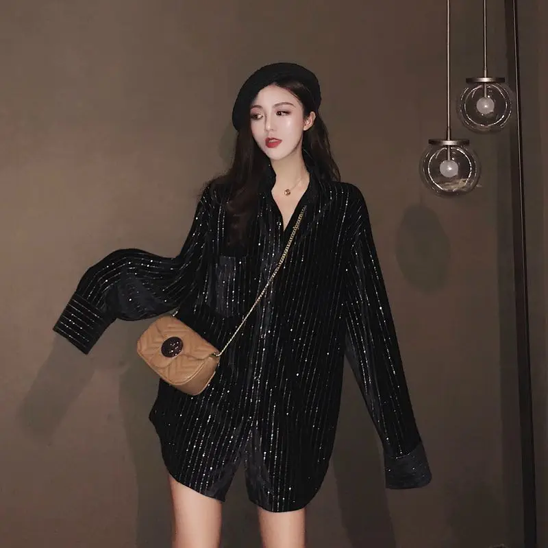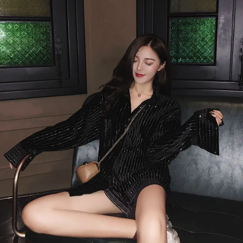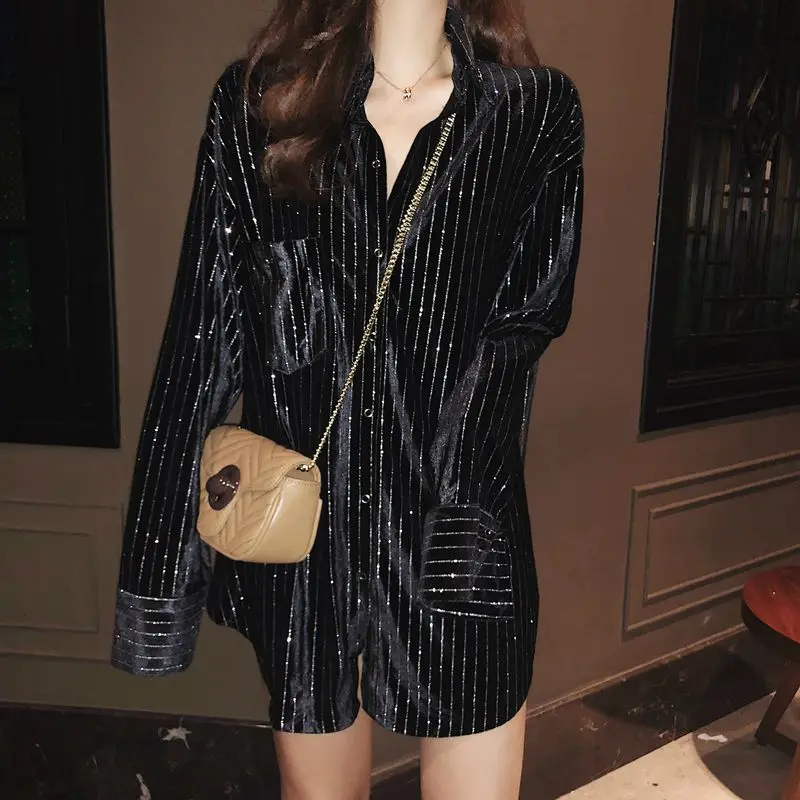 НОВАЯ шикарная блузка Cakucool, Женская Блестящая полосатая блузка с длинным рукавом и блестками, шикарная свободная Элегантная блузка средней длины для женщин