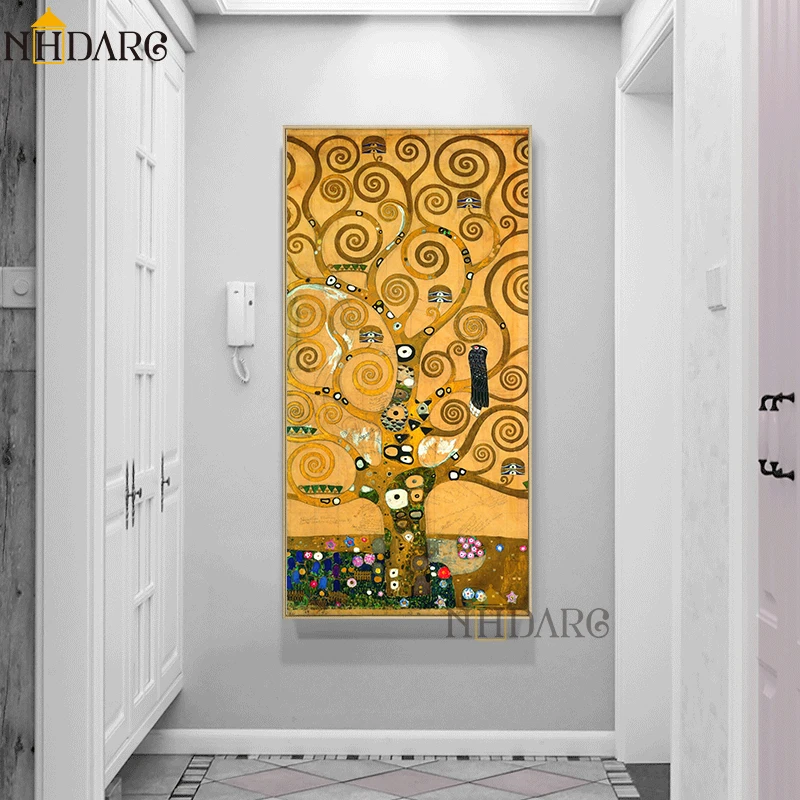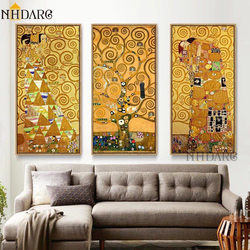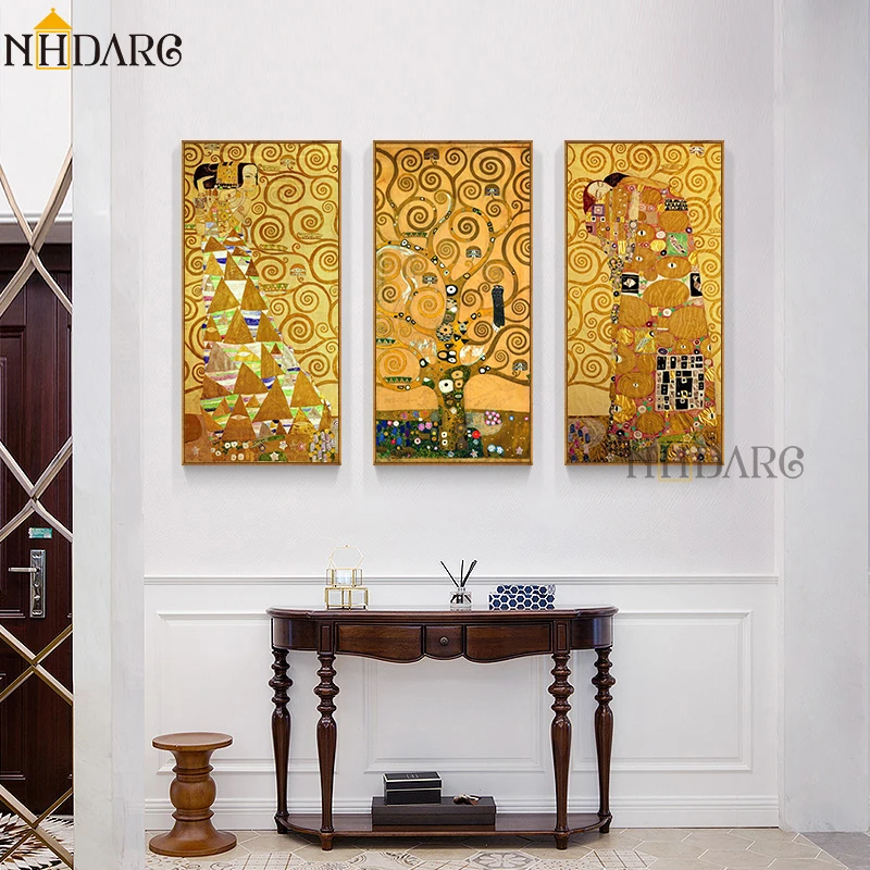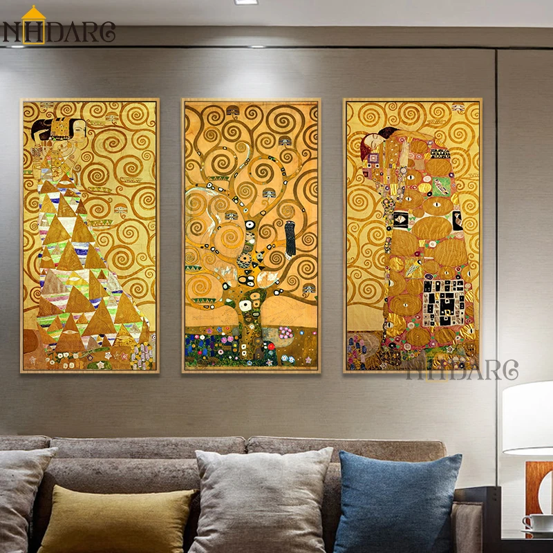 Картина на холсте постер 3 панели Густав Климт поцелуй жизнь желтое дерево настенные картины для гостиной прихожей домашний декор