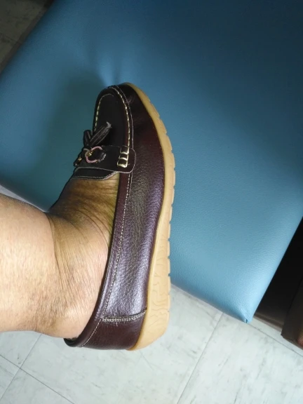 Офигенные туфельки. Конечно не кожа, а кожзам, но хорошего качества. Беру уже вторые, другого цвета. Очень удобные, мягкие. Проходила в них всё лето, попадала в них под дождь, но они остались, как новые.С возрастом ноги стали отекать и они стали моим спасением. Пришли быстро и хорошо упакованы. Спасибо продавцу!