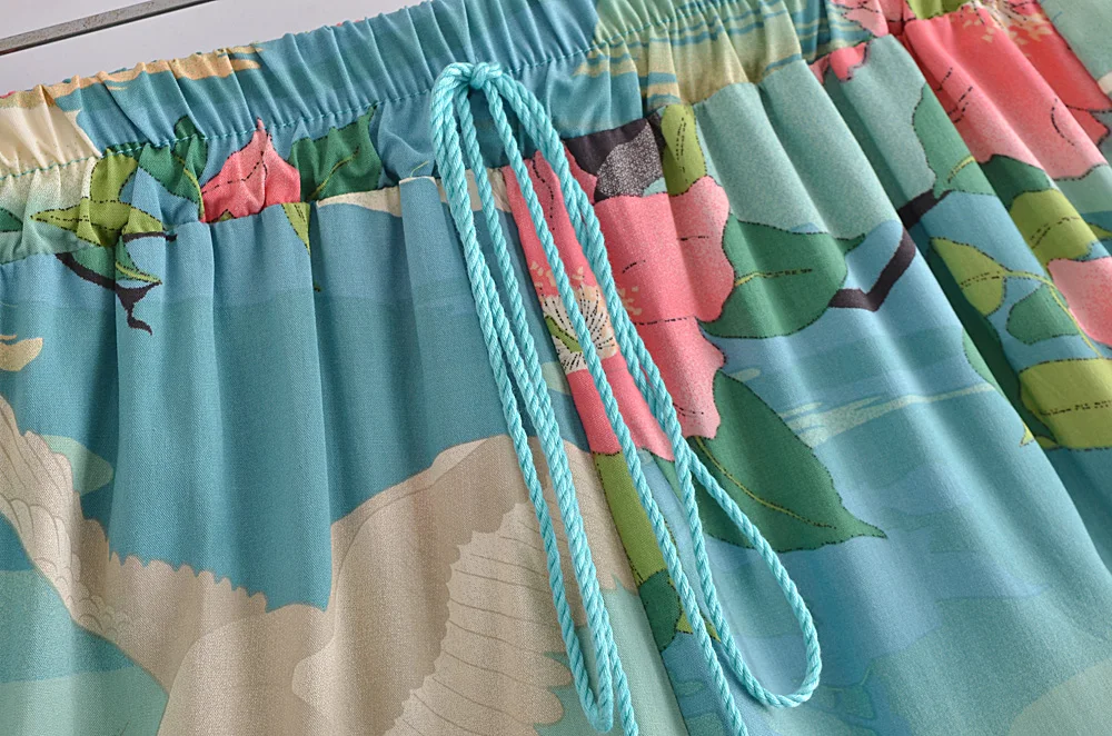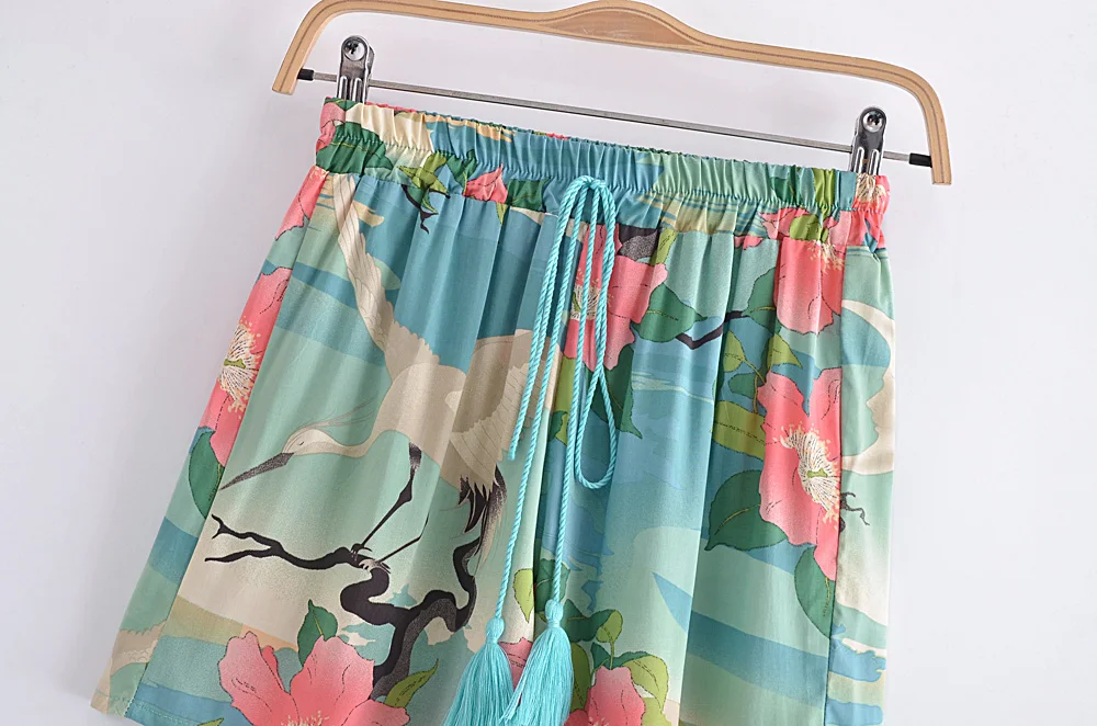 Летние винтажные шикарные женские короткие женские пляжные шорты из искусственного шелка с цветочным принтом журавлей и эластичным поясом