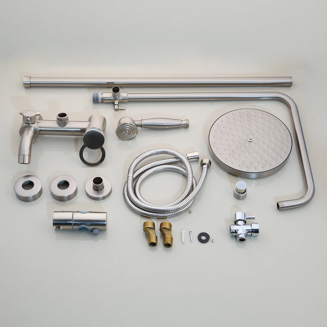 1 × душевая головка с душевой ручкой 1 × Многофункциональный сплошной латунный регулирующий клапан Пластиковый ручной душ с крючком и выходом В комплекте со всеми установочными аксессуарами