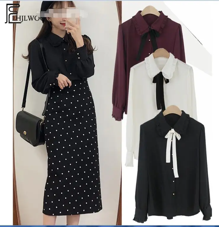 Шифоновые блузки рубашки Новые горячие продажи консервативный стиль девушки галстук-бабочка топы милые корейские темпераментные Дамы Питер Пэн воротник рубашка