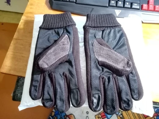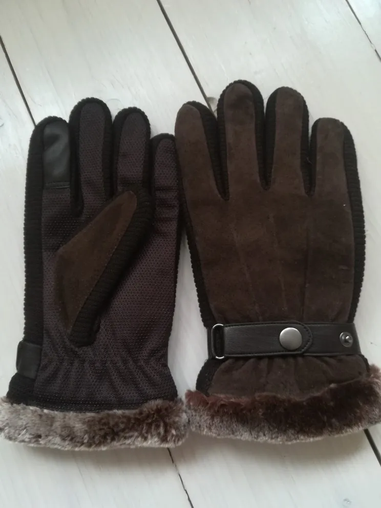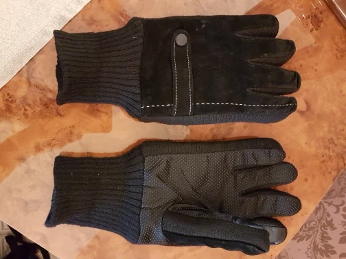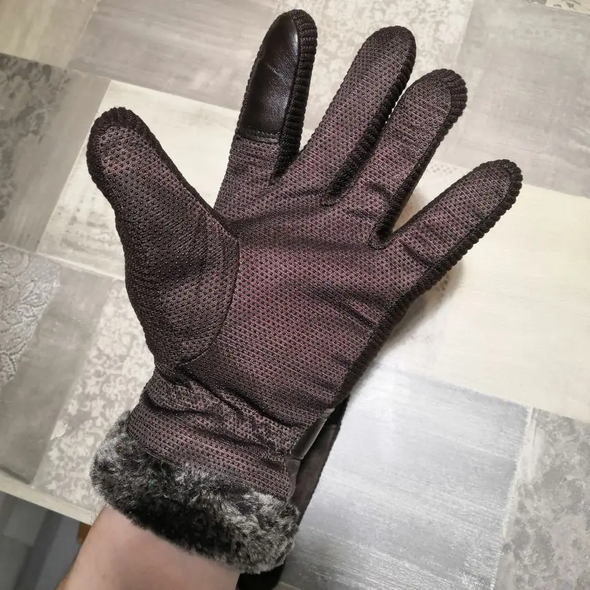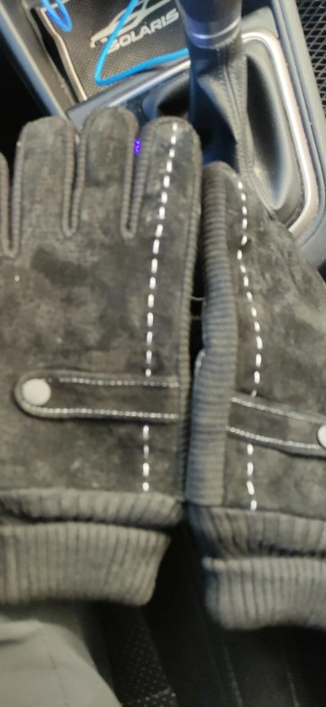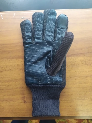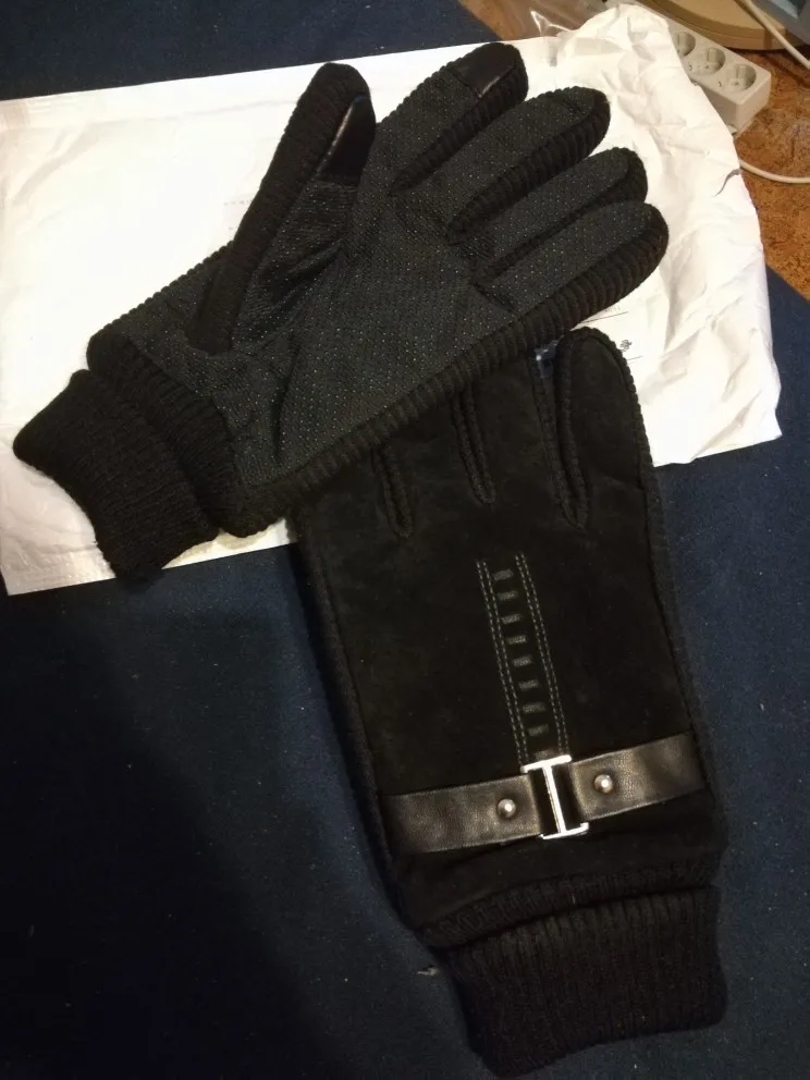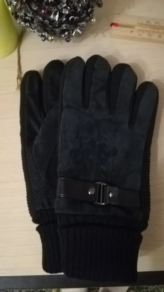 Симпатичные перчатки, толстые, теплые.Кожи (замши) там, конечно, чисто символически, но выглядит неплохо, хоть и не идеально по качеству исполнения и потёртостям. На небольшие руки подростка 14 лет слегка велики. Крупный мужчина кисть просунуть в перчатку не смог. Среднего размера, в общем. Хорошо, что есть резинки. Экран мобильника на перчатки реагирует, но смысла в этом нет, они очень громоздкие.