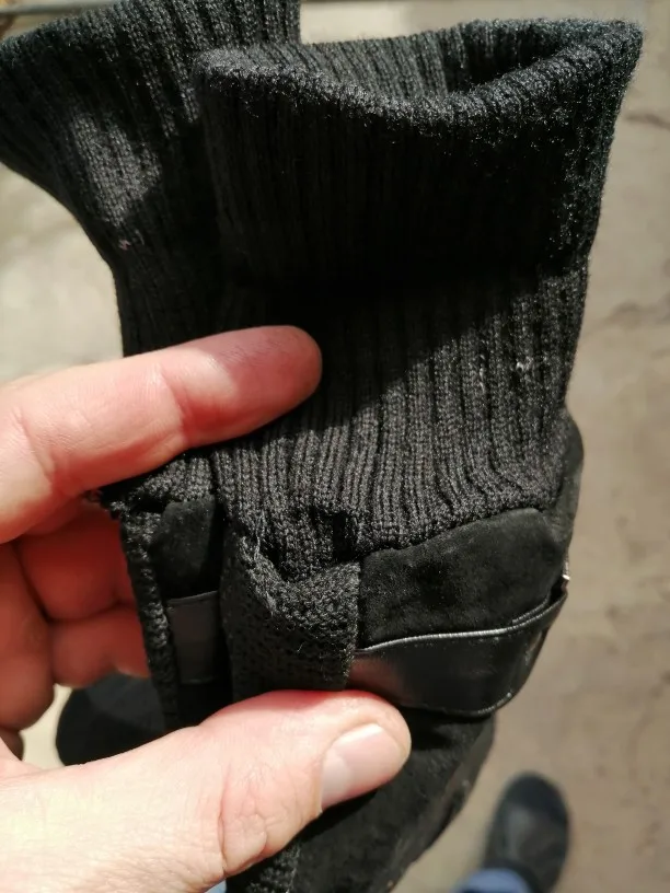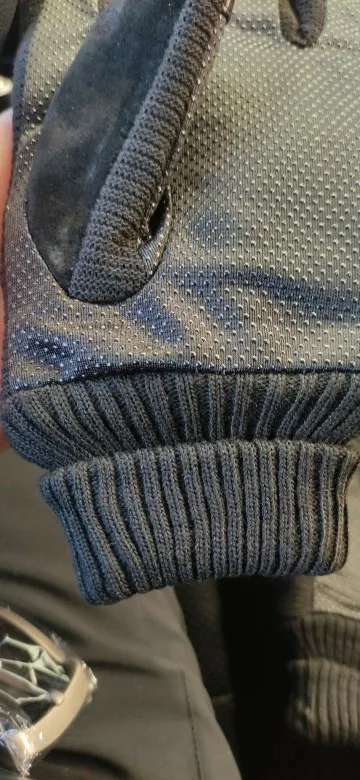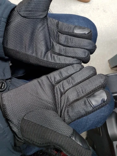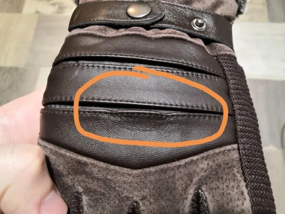 Перчатки соответствуют тому, что на фотографиях продавца. На мою небольшую руку налезли без проблем. Есть небольшой косячек на левой перчатке - кожа замята на складке (выделил на фото), вторая перчатка без нареканий. Сенсорный палец срабатывает по телефону. Минус у сенсора один - плохо скользит по экрану. Но тыкать вполне удобно. По термозащите пока сказать ничего не могу, дополню отзыв как проверю.