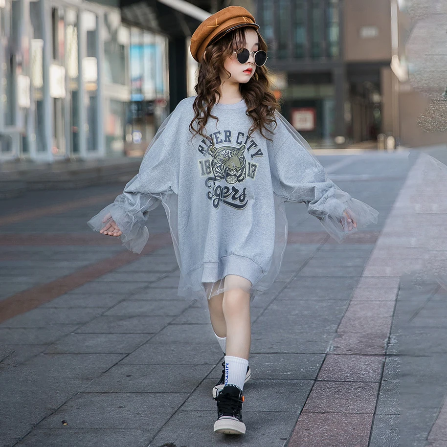 Весенне-осенняя Толстовка для девочек, детская футболка, детские топы, Детская уличная одежда с принтом тигра, сетчатая накидка с рукавами-лепестками и манжетами от 4 до 14 лет