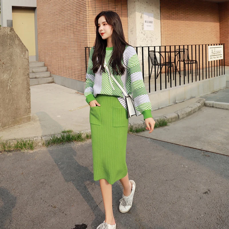Женский вязаный костюм из двух предметов, повседневный плотный свободный свитер и юбка-карандаш, зима 2018
