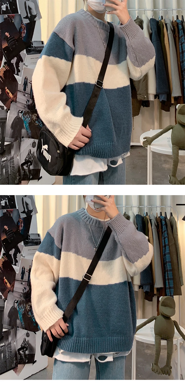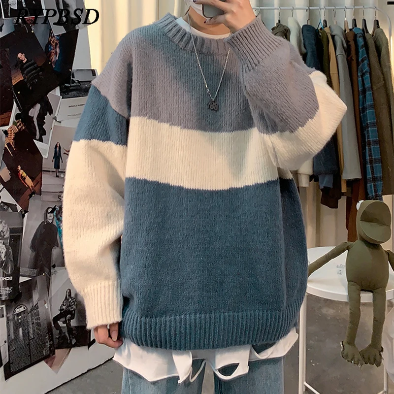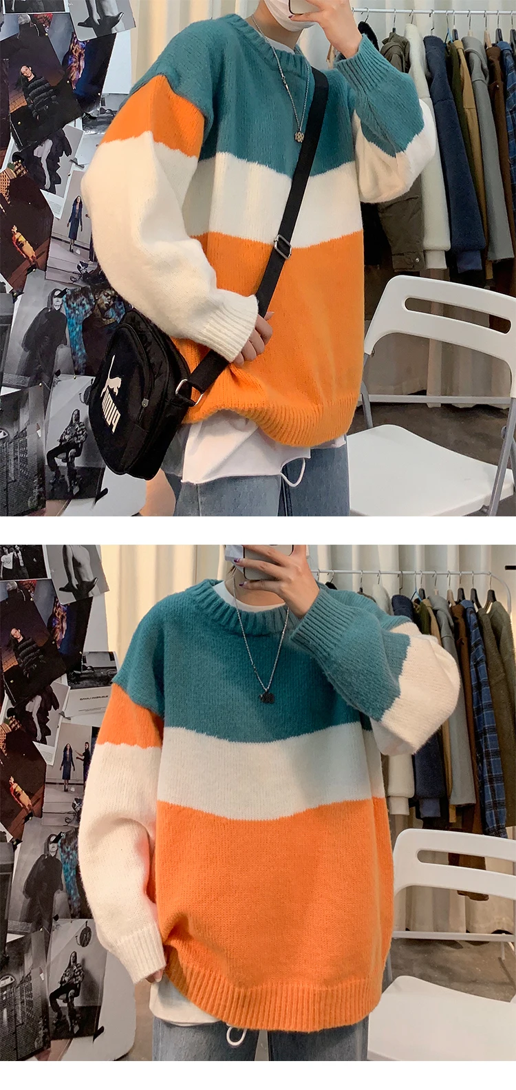 Мужской вязаный свитер, сезон осень-зима 2022, пуловер в полоску с круглым вырезом в стиле пэчворк, теплые модные мужские и женские свитера оверсайз в Корейском стиле Харадзюку