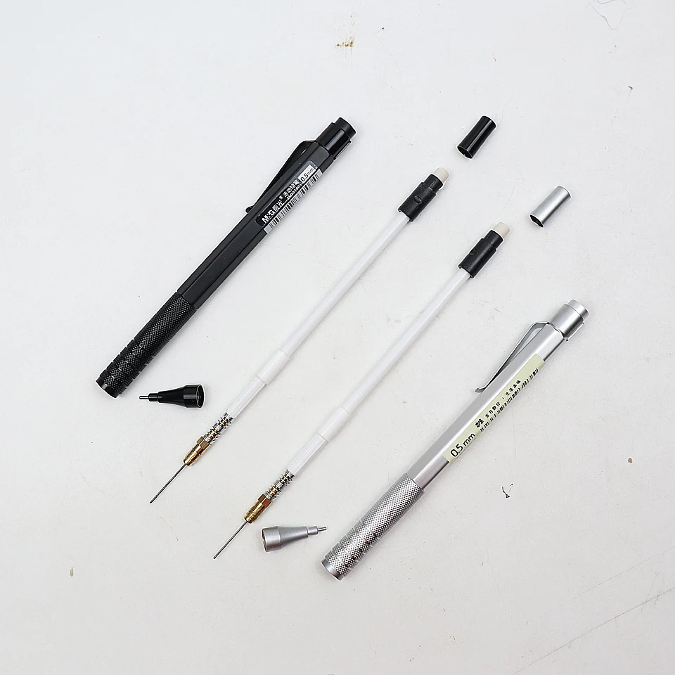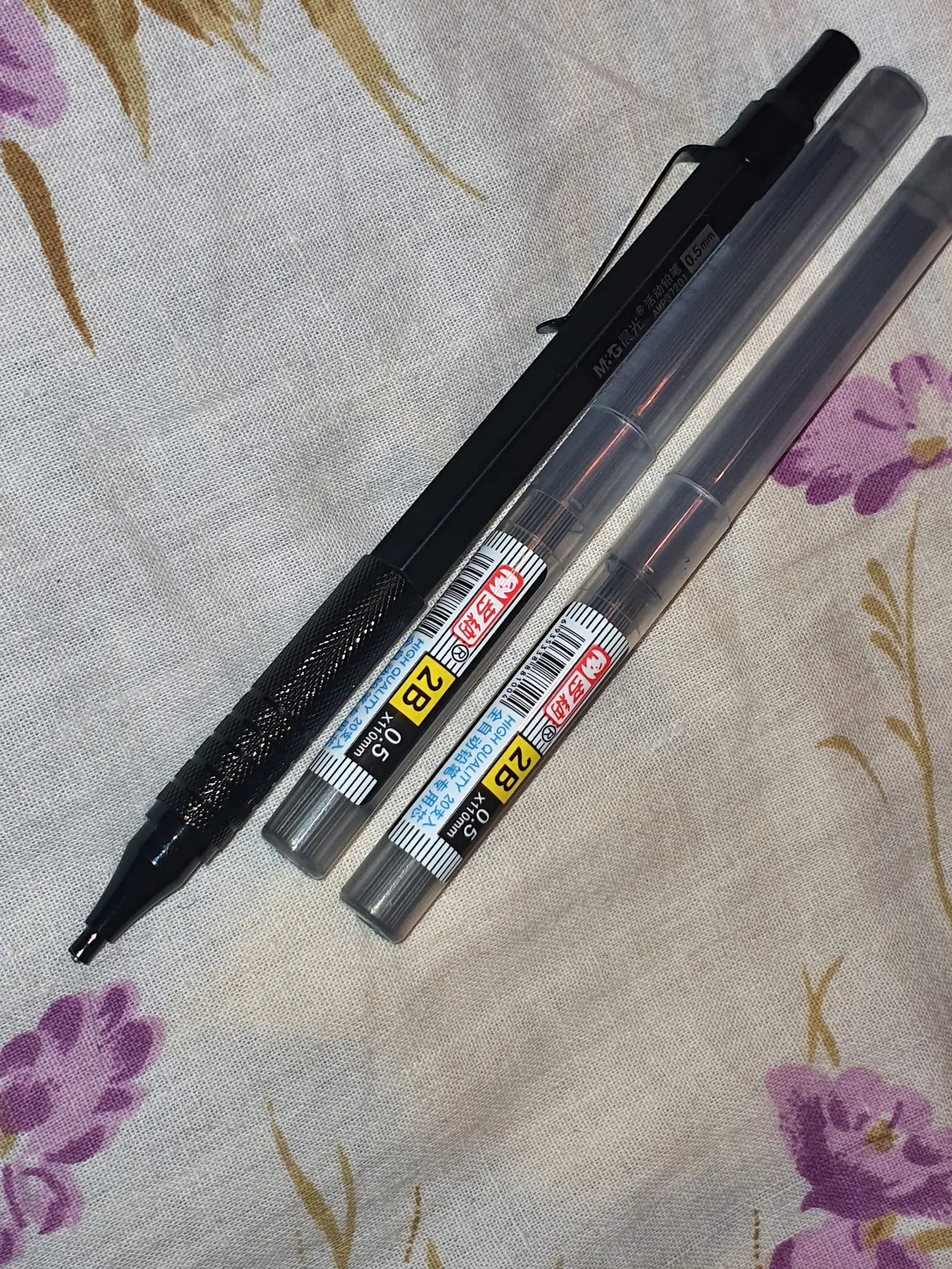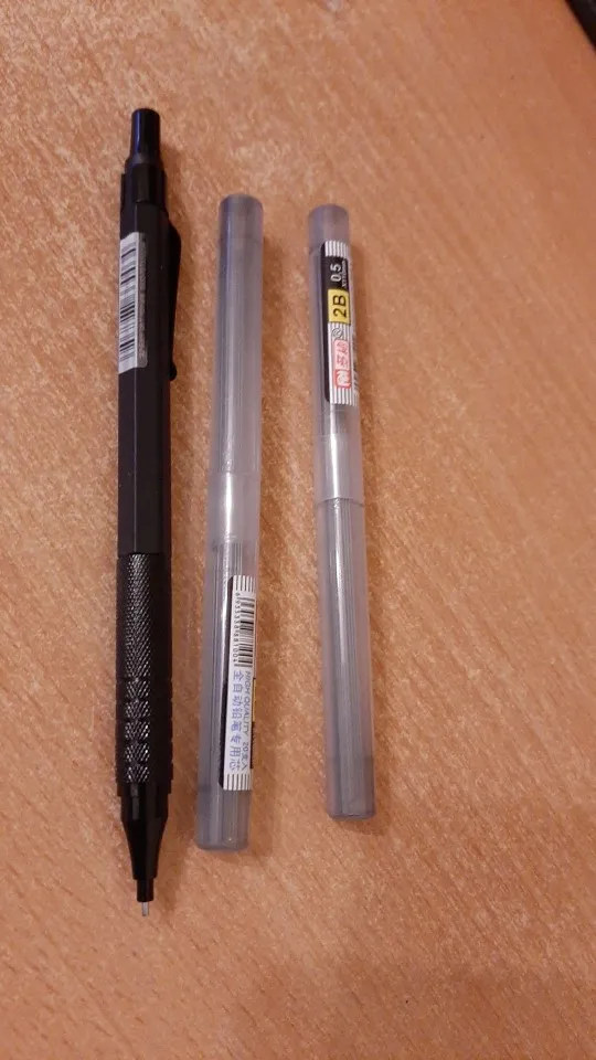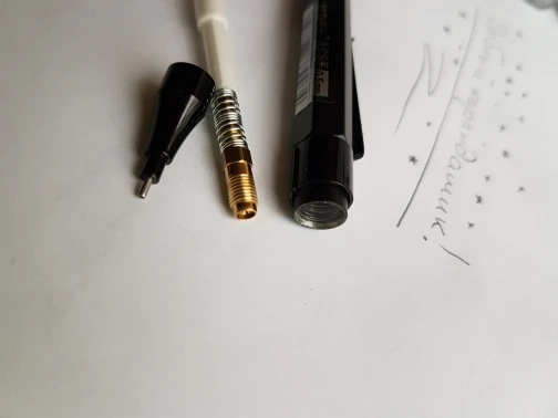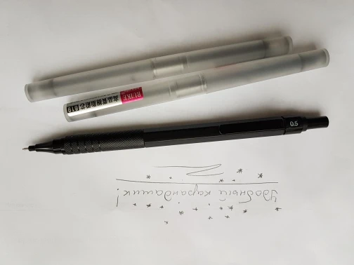 Грифель не нравится, жестковат и скрипит. А вот сам карандаш в руке держать приятно, тяжелый металл. Вставила свои любимые стержни и Работать очень комфортно