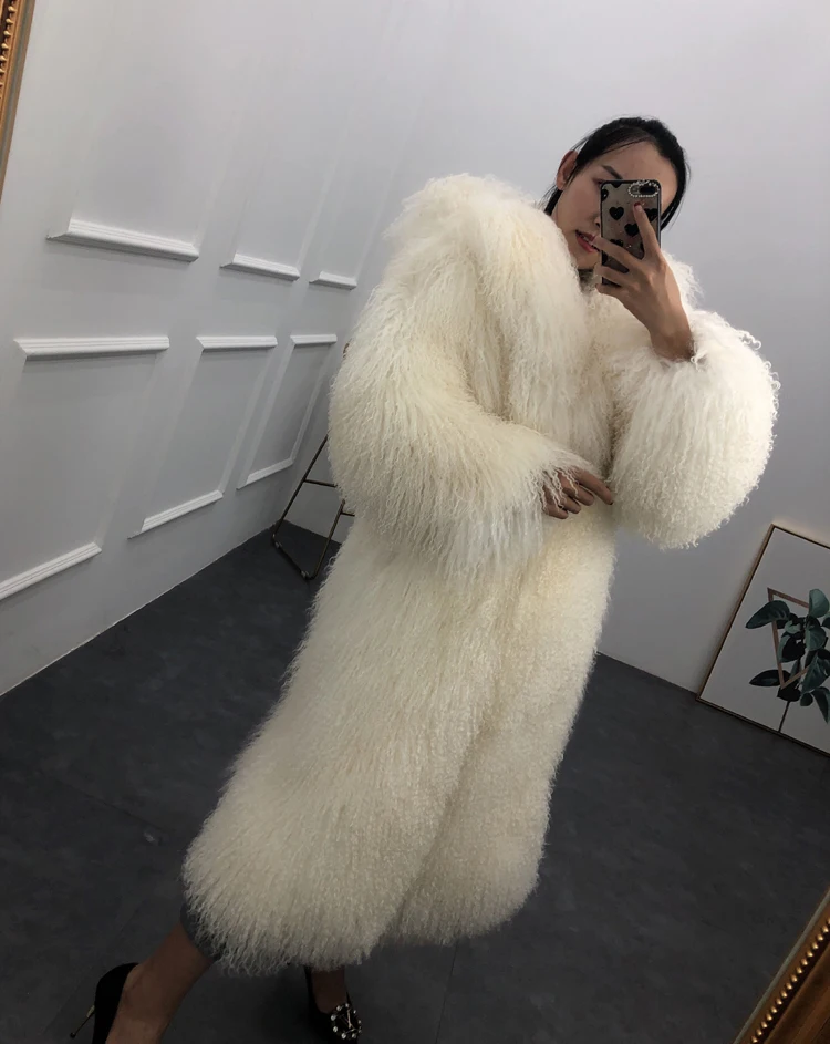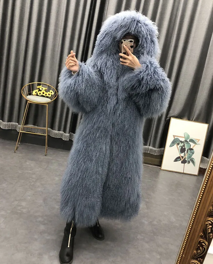 Пальто женское из натуральной монгольской овечьей шерсти, с капюшоном, длинное, для улицы, зима Одежда из овечьей шкуры