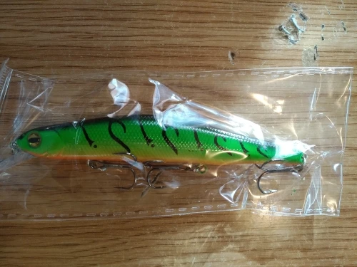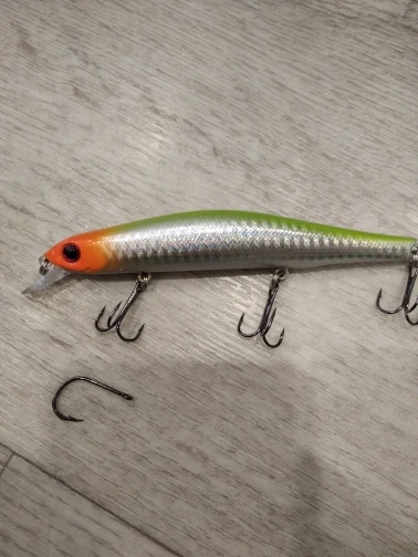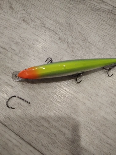 Хороший длинный воблер. Описание полностью соответствует действительности. Нет потëртостей краски. Радует, что в каждой посылке у данного продавца есть маленький подарок (у меня этот крючок погнулся при транспортировке, но всë равно приятненько). Нужно обязательно проклеить петли, совершенно все (за минус это не считаю, потому что даже на дорогих брендовых воблерах встречается данный изъян)