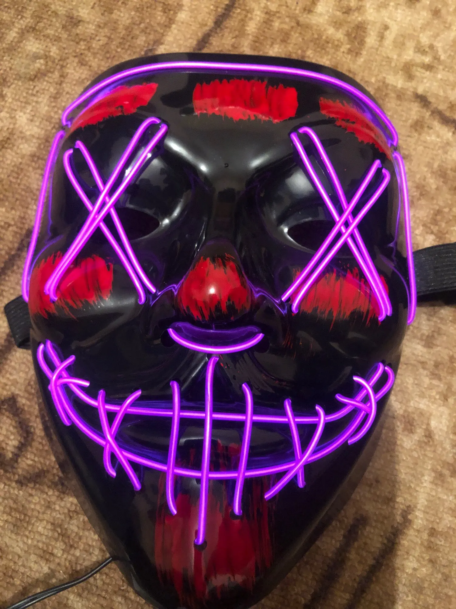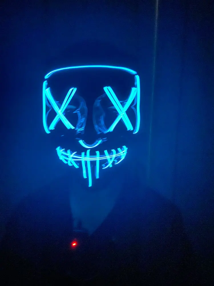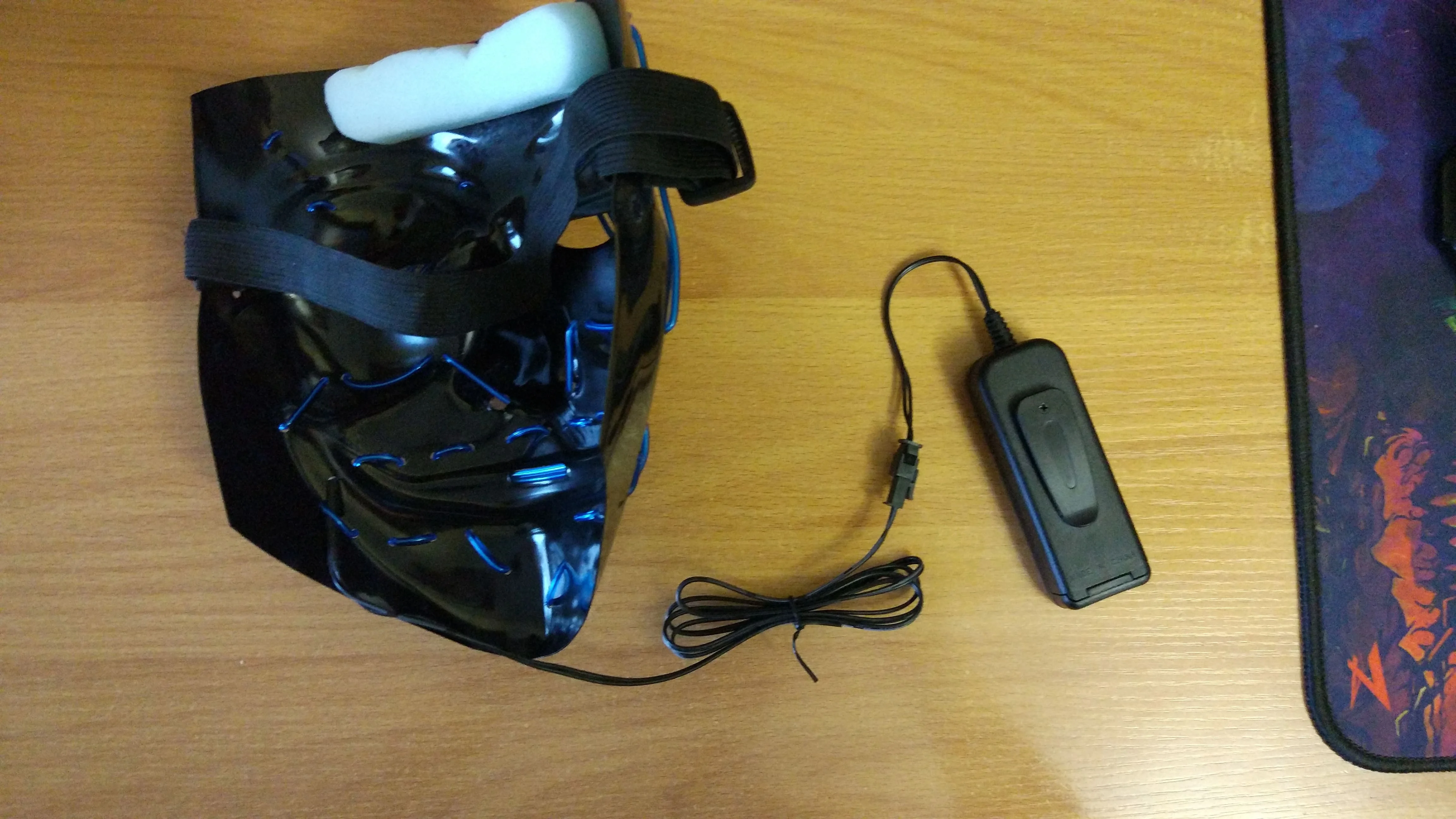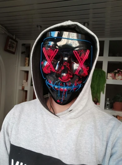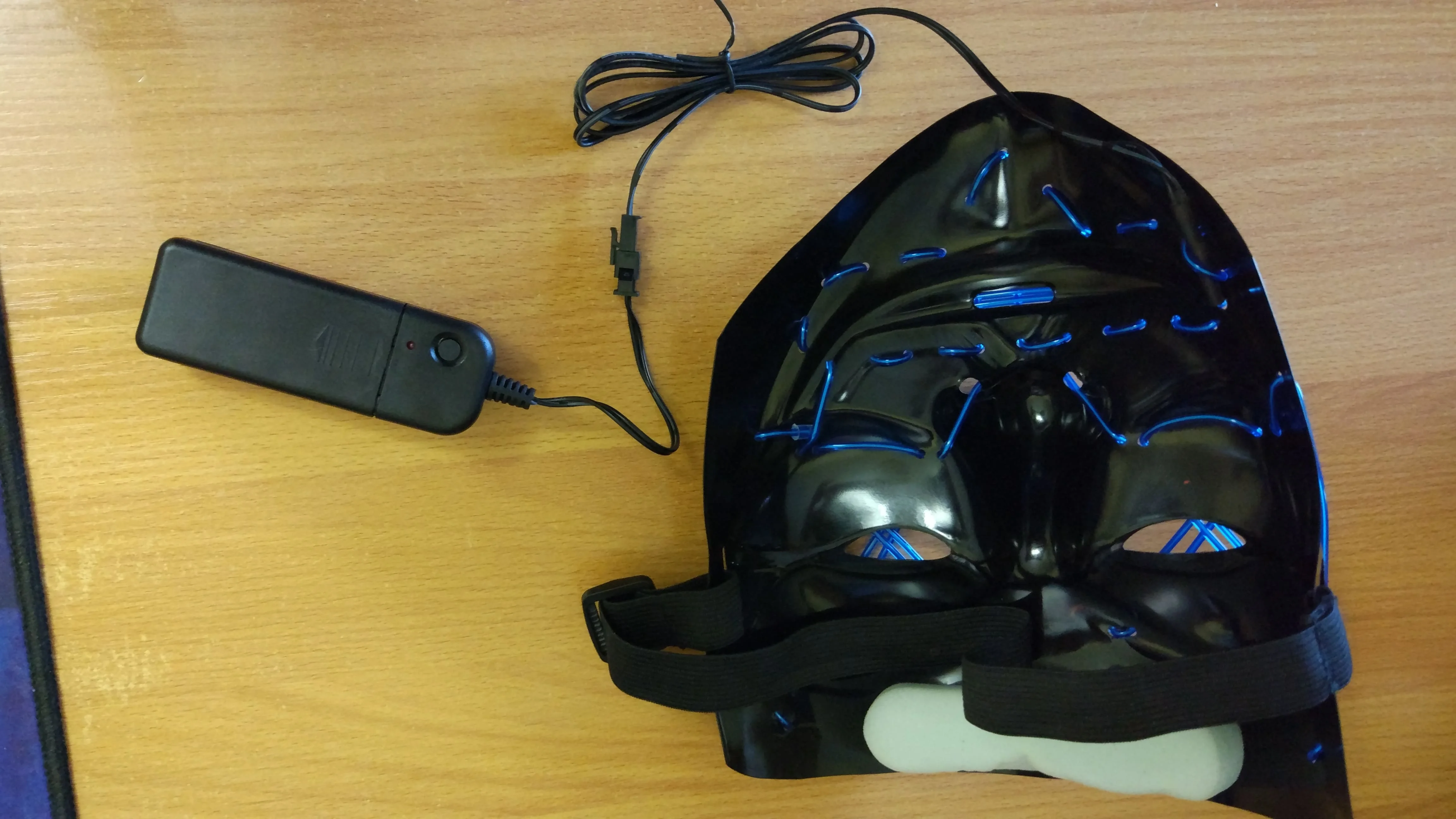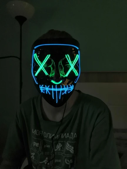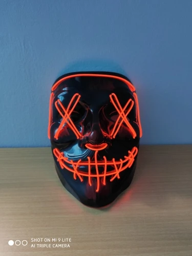 Соответствует описанию. Доставка быстро. Светит ярко. Маска классная. Есть 3 режима - свечение, медленно моргает и быстро моргает. Провод не короткий. Matches the description. Delivery is fast. Shines brightly. The mask is cool. There are 3 modes - glow, blink slowly and blink quickly. The wire is not short.