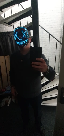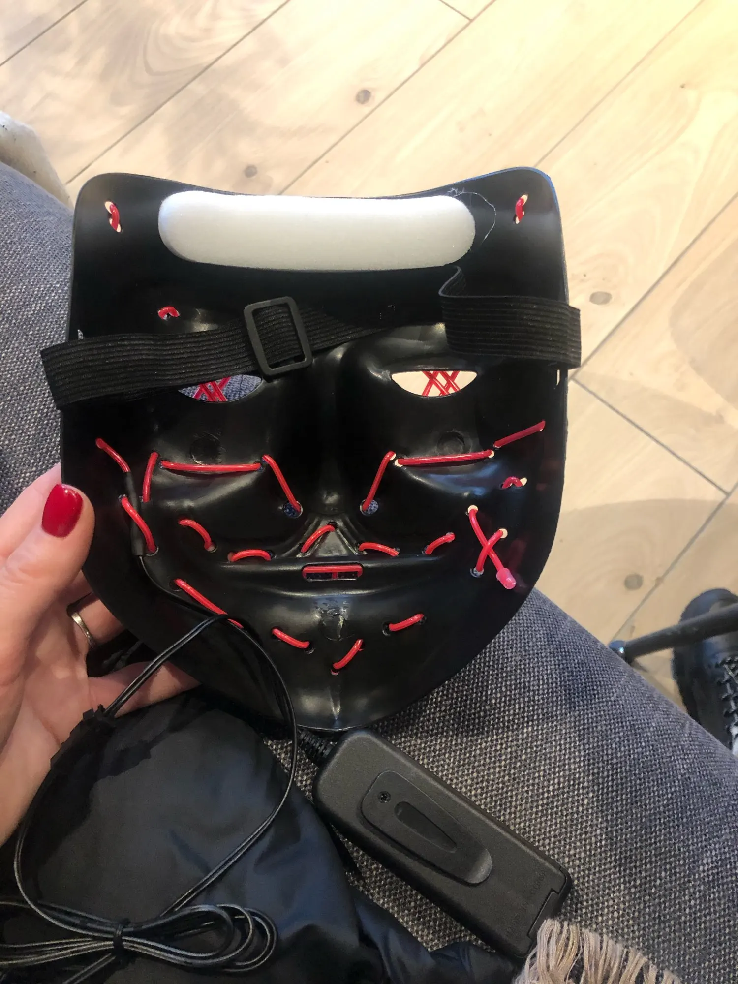 Хорошая маска, из нормального пластика. Работает из коробки, батареек АА в комплекте не было. Соседи шарахаются, в тёмном подъезде. Посылка пришла последней, из заказанных с Плюсом.