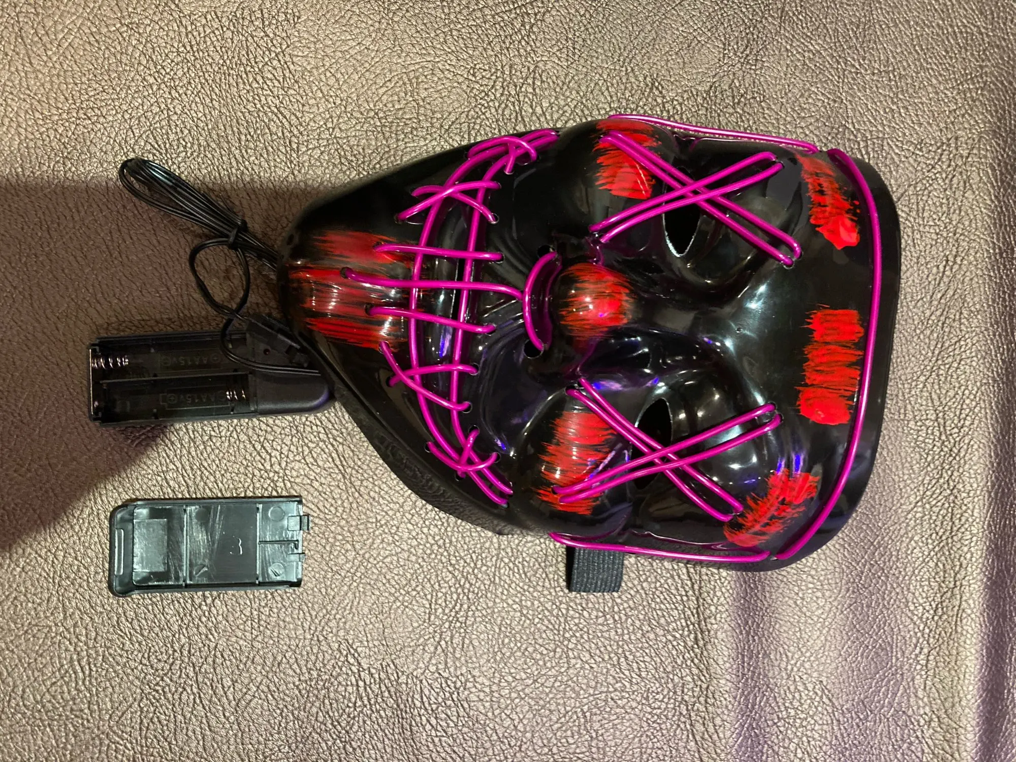 Маска красиво светится но она из пластика, прикольно повесить на подголовник в авто