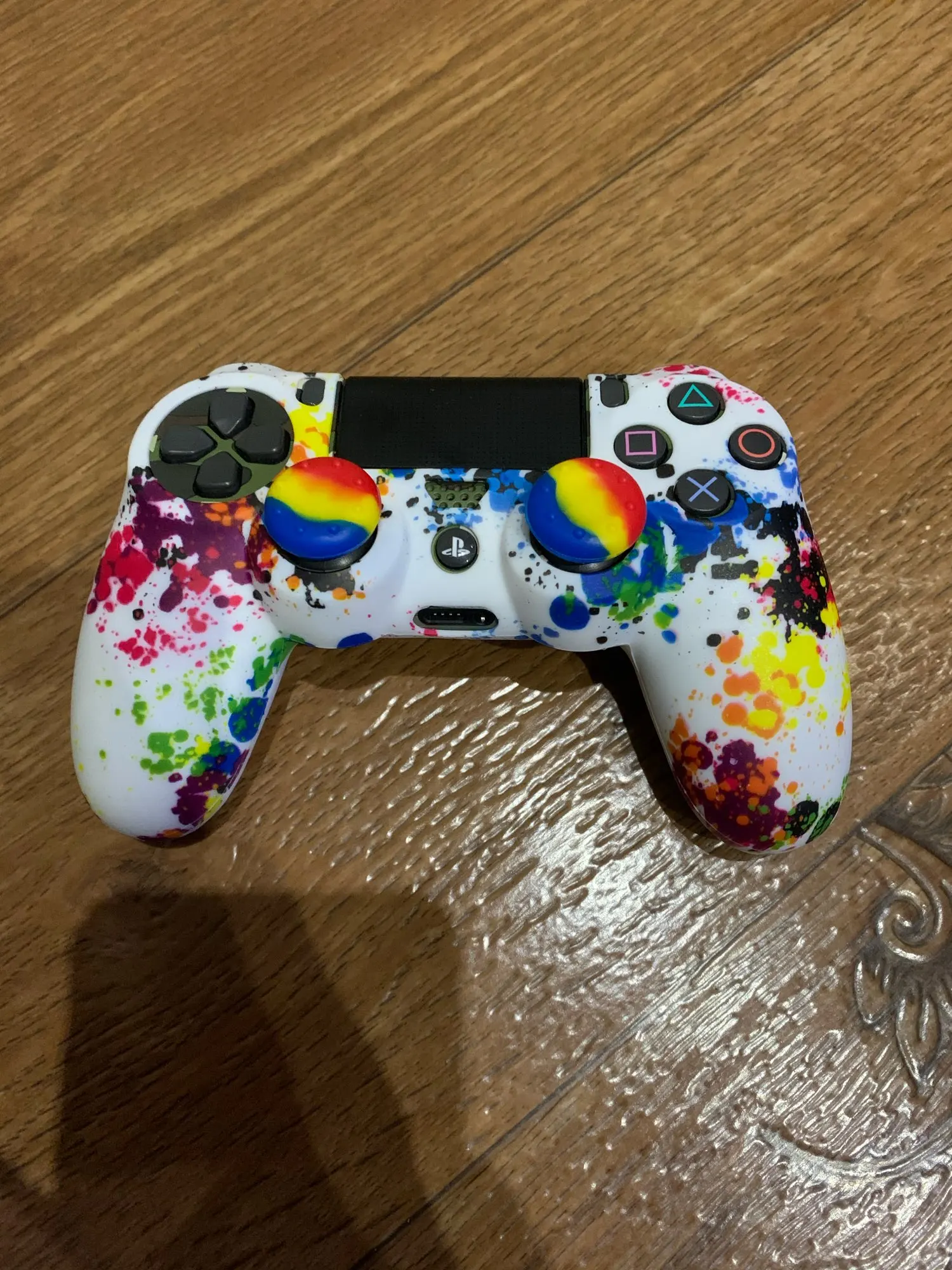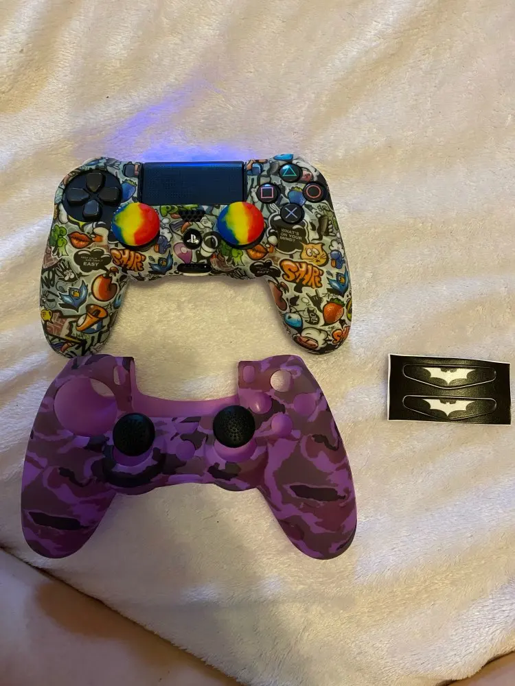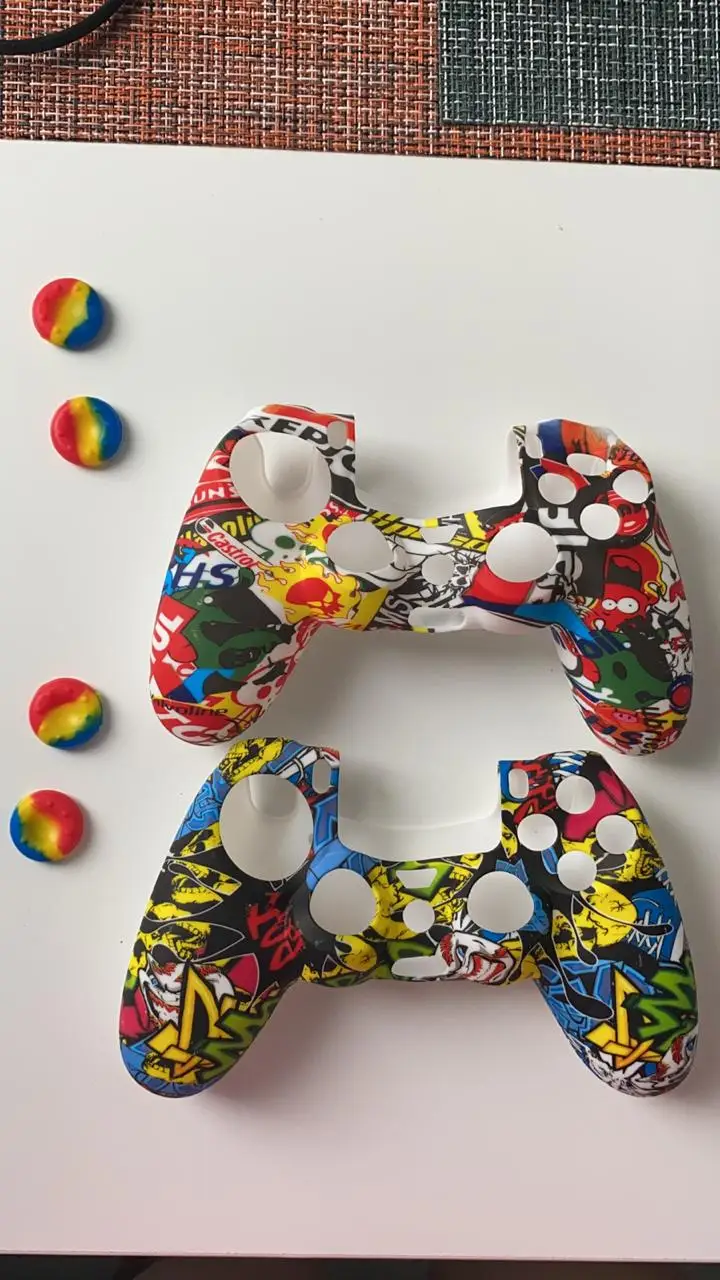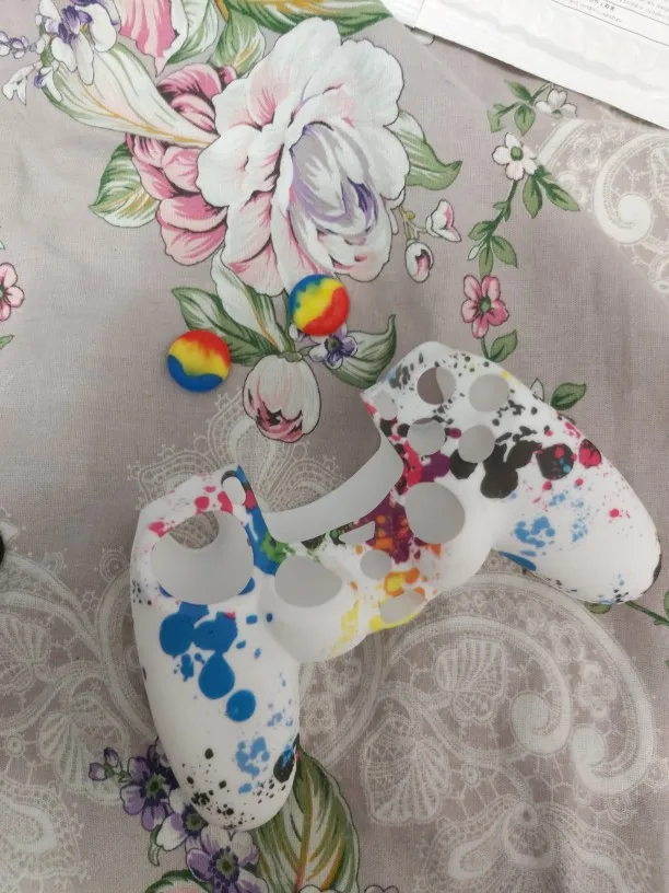 чехол думал будет не просвечивающим, на ощуп приятный, малость кривой(у стиков узковат и на кнопки малость не удобно нажимать), а в целом норм чехол за свои деньги и подарочки ничего(наклейка маловата а колпачки большеваты)