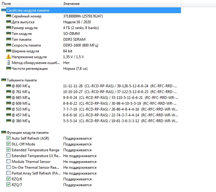 Доставка 18 дней. Товар соответствует описанию. Продавца рекомендую. Проверил - работает. Tanbassh 8 ГБ DDR3-1600 SDRAM (11-11-11-28 @ 800 МГц) (10-10-10-27 @ 761 МГц) (9-9-9-24 @ 685 МГц) (8-8-8-22 @ 609 МГц) (7-7-7-19 @ 533 МГц) (6-6-6-16 @ 457 МГц) (5-5-5-14 @ 380 МГц) Размер модуля 8 ГБ (2 ranks, 8 banks); Тип модуля SO-DIMM; Ширина модуля 64 bit; Напряжение модуля 1.35 V / 1.5 V