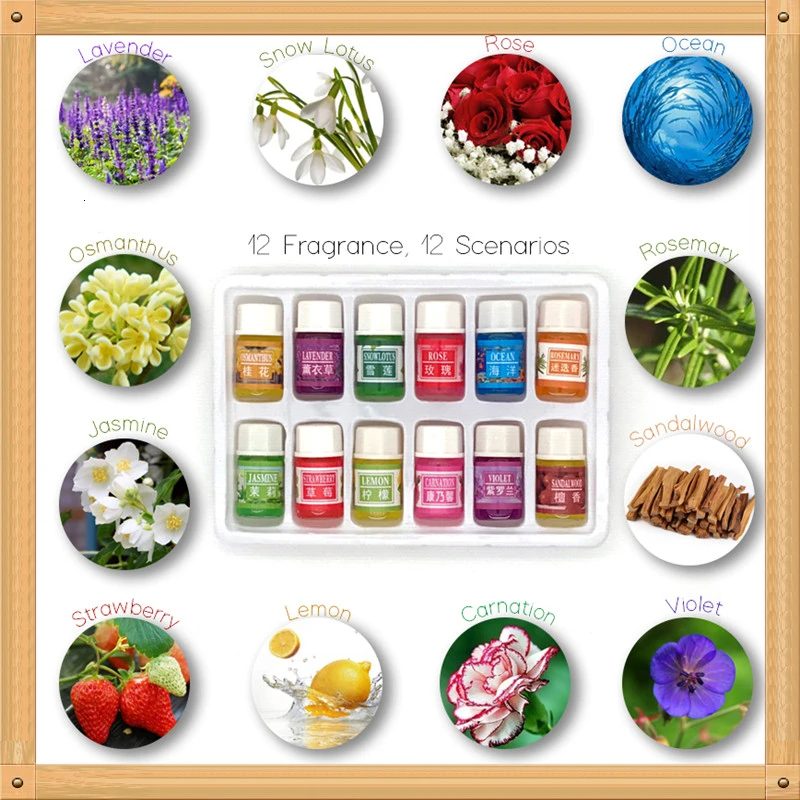 12 видов ароматов:1 Лаванда, 2 розы, 3. Жасмин, 4 Gui. Цветы, 5. Сандаловое дерево, 6. Океан, 7. Лимоны, 8 чая, 9. Лотос, 10. Розмарин, 11. Фиолетовый, 12. Гвоздика