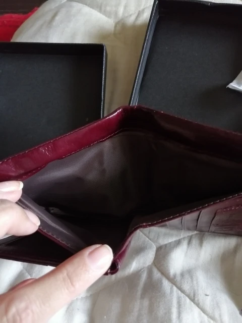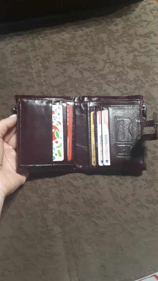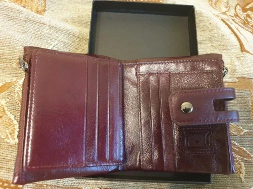 Продавец не отвечает на сообщения. Доставка быстрая DPD до почтомата. Нигде это не написано о том, что будет почтомат. Я пыталась через пару часов поменять адрес доставки, но продавец не отвечал на сообщения в течении недели. Но все тщетно, пока не получила сообщение от DPD о почтомате. Вся неделя была на нервах. Кошелёк отличного качества, цвет как и хотела темно вишнёвый. Кошелёк прислали в коробочке, ничего не помялось, не заломалось. В отделе, где бумажные денежки, замочка нет. Товаром довольна.