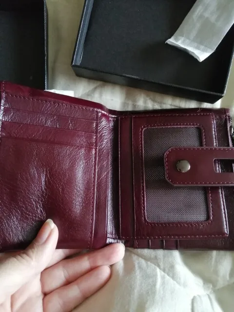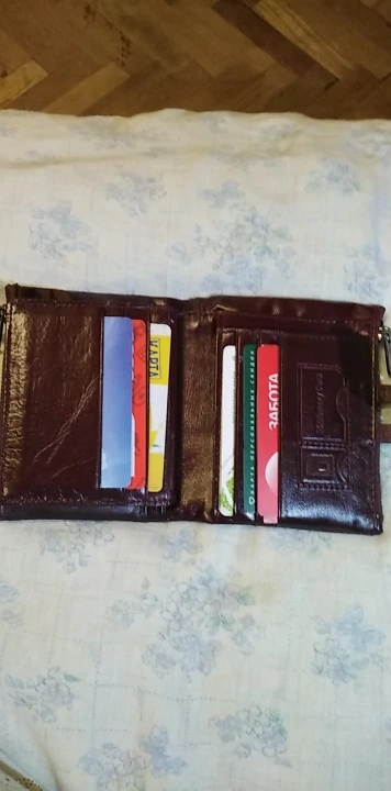 Кошелек пришел достаточно быстро,за две неделе,привез курьер на дом!В целом кошелек хорошего качества,пришел в коробке в пыльнике.Сомнения по счет натуральной кожи,но на ощупь мягкий и приятный.Очень много отделений для карт,одно отделение для купюр и два для мелочи,что очень удобно.Цвет такой же насыщенный бордовый как на фото у продавца.В целом покупкой довольна.Рекомендую!