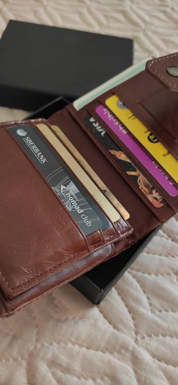 пока нравится, запах дней 5 был ,насчёт натуральности кожи сомневаюсь, банковскую карту в ячейку с сеточкой не воткнуть и не вынуть.