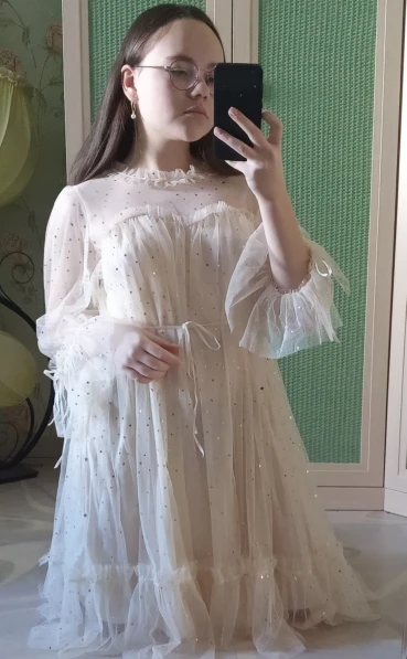 Платье шикарное, смотрится невообразимо волшебно и легко, брала на рост 148, смотрится симпатично, по плечами нормально, доставка очень быстрая, но отправления пришлось ждать около двух недель, но я думаю это того стоит. Сшито аккуратно, нитки нигде не торчат