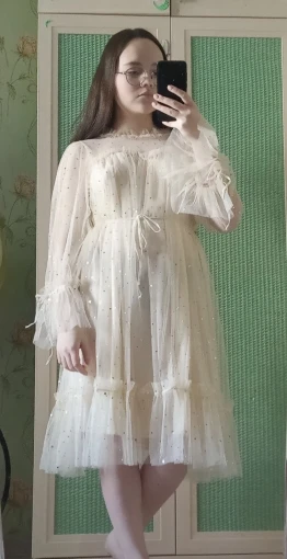Чудесное платье! Очень нежное и безумно красивое. Есть 4 завязки - на каждую руку, шее и талии, поэтому всем подойдет. Достаточно тонкое и немного просвечивает. Но в целом всем советую!