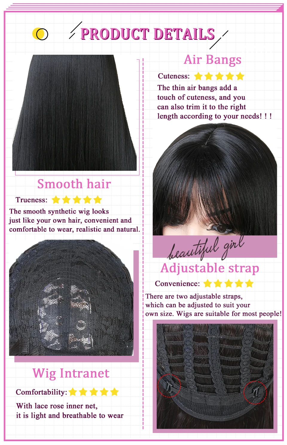 Очень хороший продукт по цене! Волосы шелковистые и длинные, хотя мне пришлось немного порезать бахрому, так как она была слишком длинной для меня, но кроме того, я очень доволен! Спасибо также за милые татуировки. Быстрая доставка (2 недели)