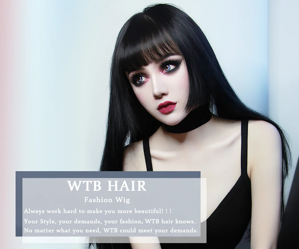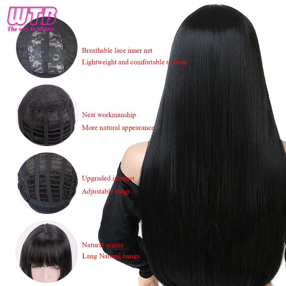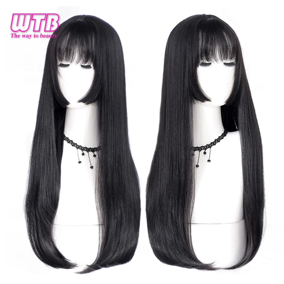 Женский синтетический парик WTB, длинные прямые волосы, черные, с челкой, для косплея вечерние, Рождества