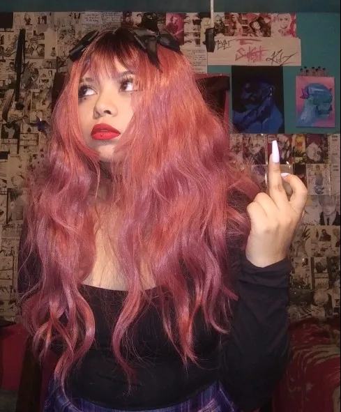 Очень красивый парик! Челка такая милая, а волосы очень мягкие. Мне нравится, насколько эластичный парик, его проще надевать. Поставляется с бесплатным ожерельем, брелком и временными татуировками. Очень мило.